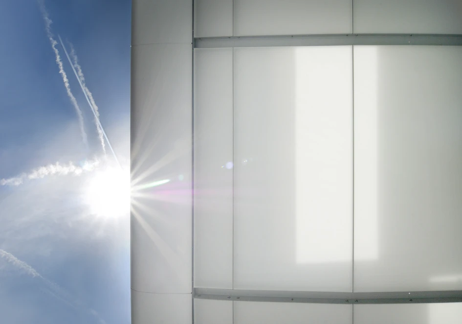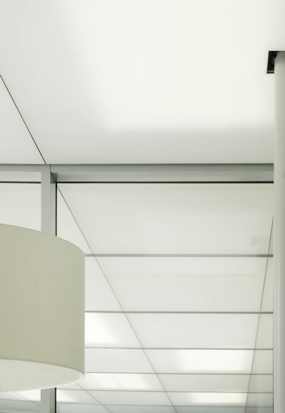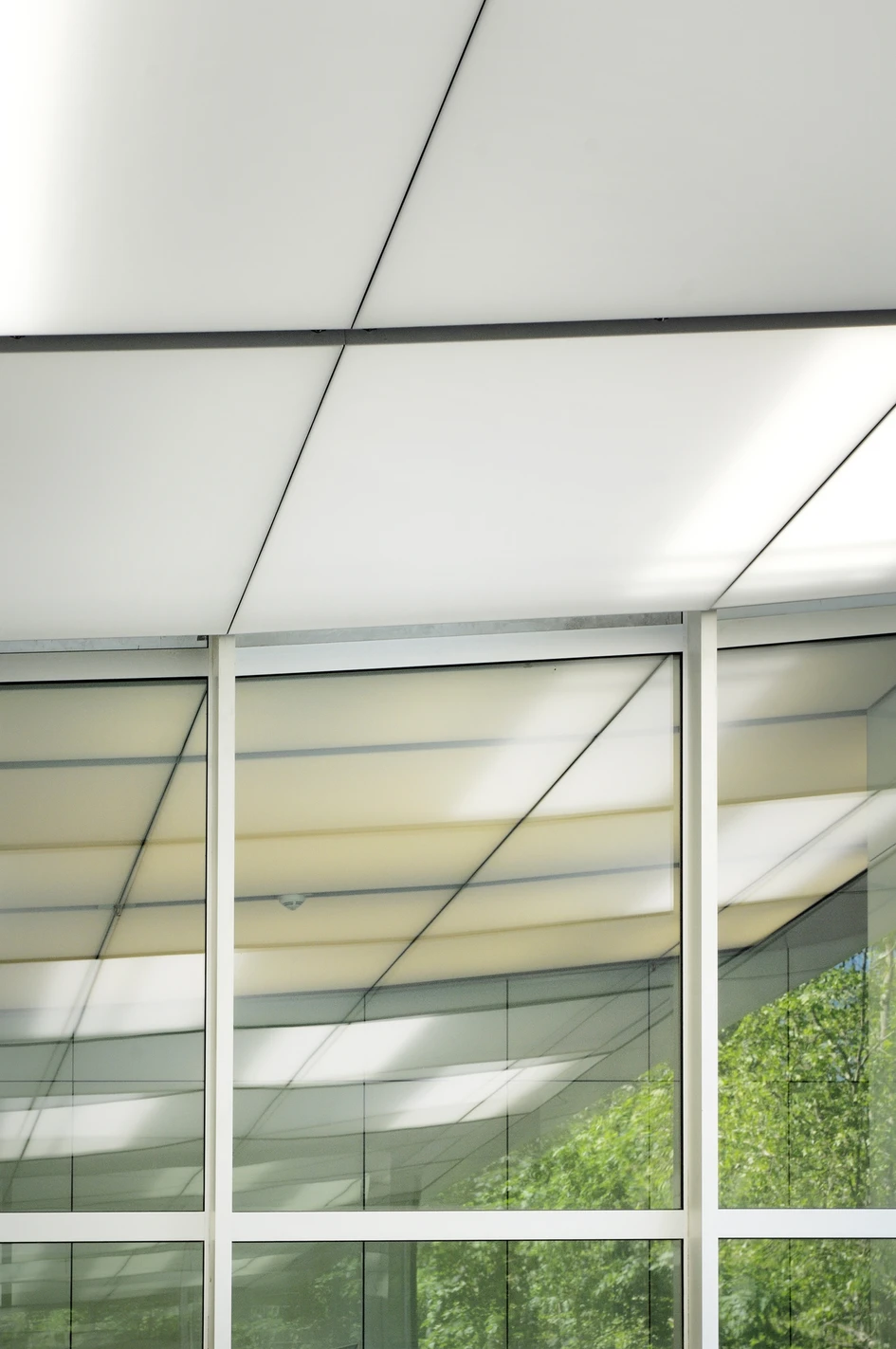 This enables a display of light depending on the situation. By day, the varying intensity of light and position of the sun cast a shadow onto the underside of the porch canopy. When it is dark outside, the roof is illuminated from inside, lighting up the forecourt. Within the foyer, the architects have limited themselves to a few high-quality materials such as glass, brush-finished steel and the translucent membrane of the light ceiling.