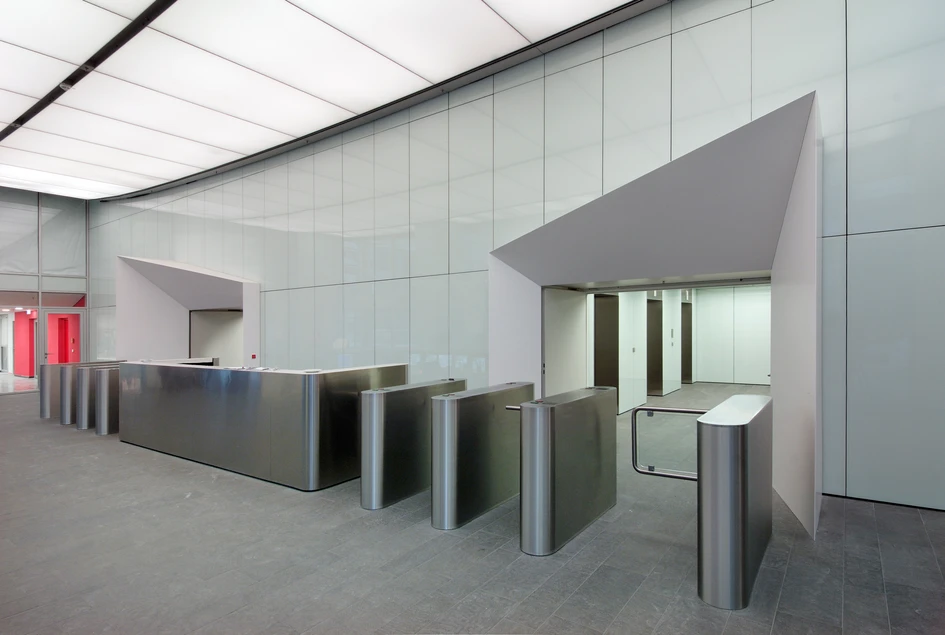 The suggestion by architects, Just.Burgeff, to design the forecourt and foyer of the FBC office tower with a continuous light ceiling was accepted by the German Association for Real- Estate Funds (DEGI), the project being completed following two years of planning and construction. The office block itself was designed by the architect Richard Heil from Frankfurt am Main in 1980.