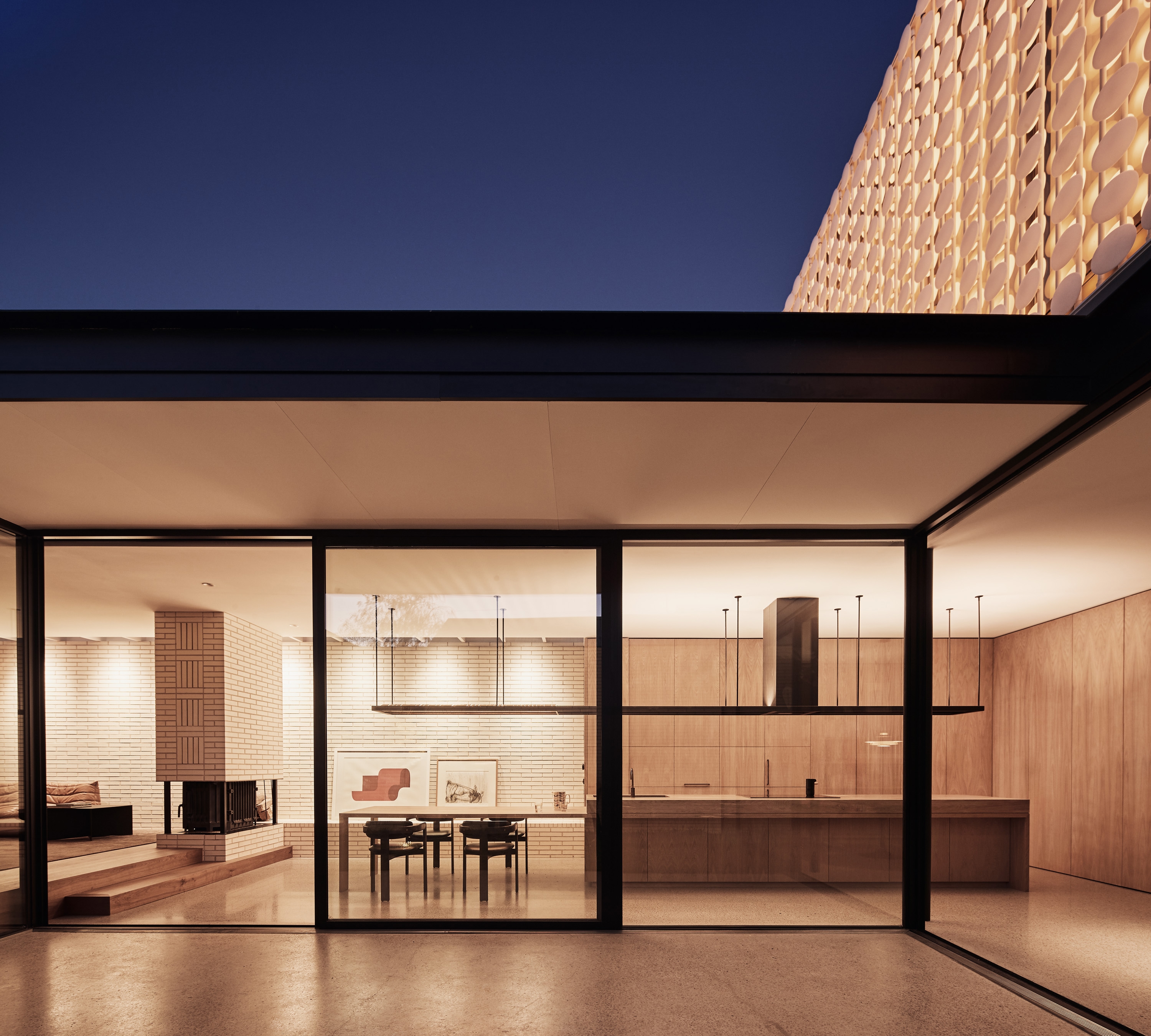 This screen provided an opportunity to not only modulate the character of natural light throughout the year, to create a constantly changing play of shadows and textures, but to also become the primary illuminated surface at night for the internal spaces. The screen also plays an important role in controlling the amount of direct sunlight allowed to penetrate into the upper level’s interior and as well as limiting sight lines to the adjoining neighbouring properties.