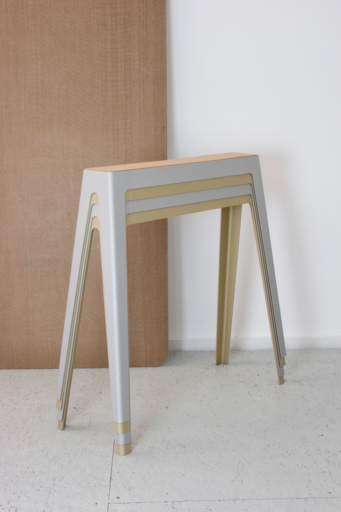 This lightweight trestle table for working environments is designed according to the Cradle to Cradle principles. Based on a very innovative use of natural materials, a composite tabletop has been developed that consists of jute and linen textiles and bio-plastic. Because of the application of biodegradable fabrics and plastics, the tabletop is completely compostable. Moreover, it gives the material a warm and human look and touch. The lightweight table top is supported by a pair of stackable, anodised aluminum trestles.