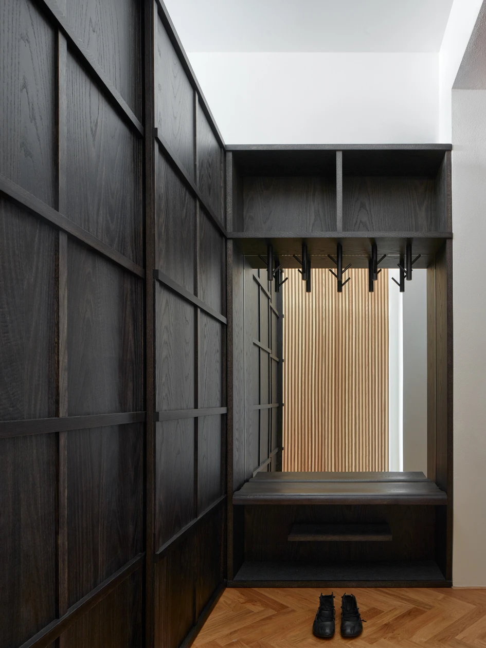 The children's sleeping area is located in the two-level box. The lower bed serves as a couch during the day. The upper bed is hidden behind a small door. A box is lined with oak slats. Slats gradually transition to the wall separating the bathroom, which becomes a part of the built-in furniture. Thanks to the doors that reach up to the ceiling, the bathroom does not draw additional attention.