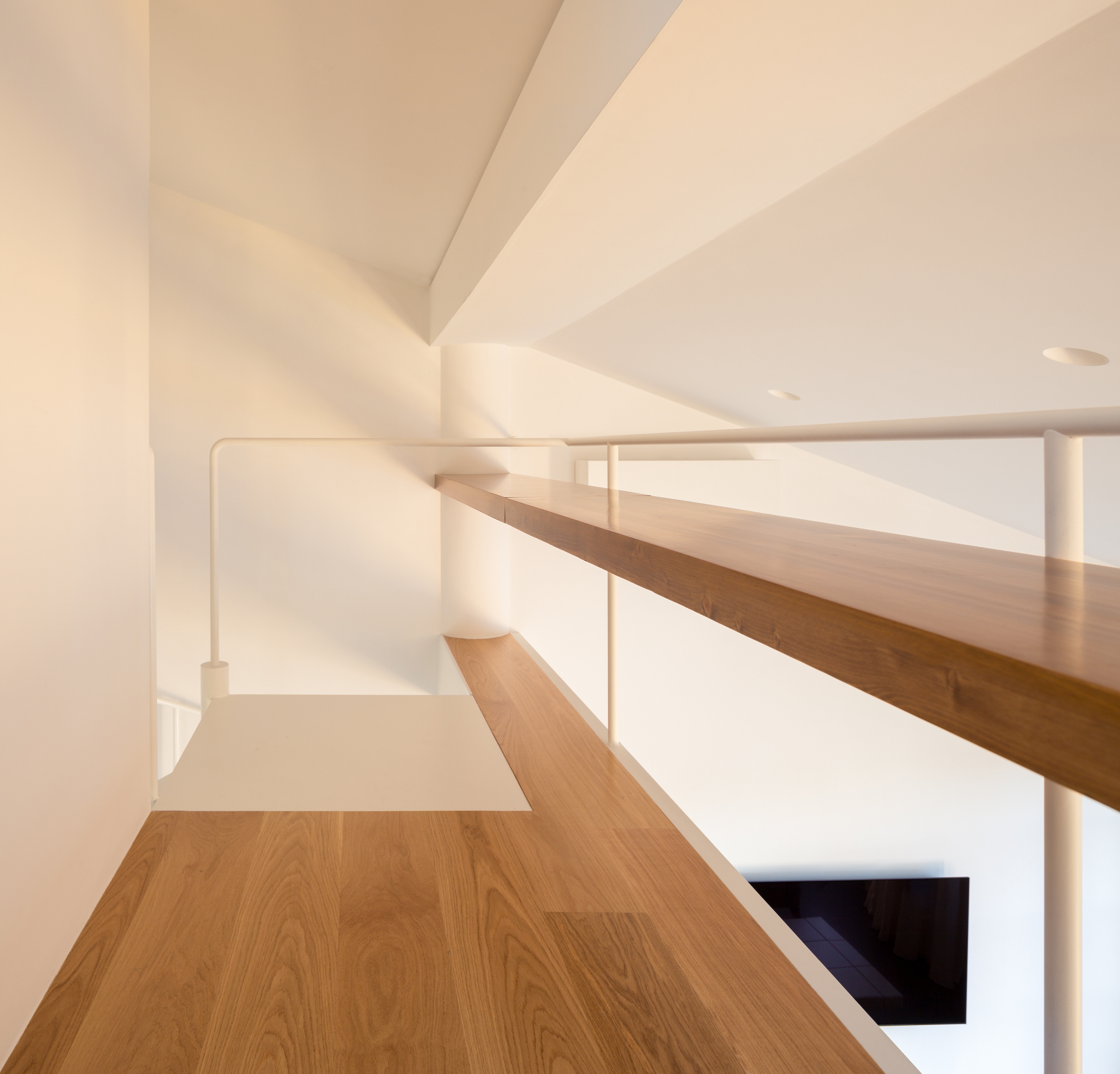 The first floor contains the master bedroom, a bathroom and a dressing room. Its access is through a light circular staircase and it has been conceived as an open integrated space with the main floor but adding some privacy through a soft separation. An oak shelf is placed along the corridor defining a working area. The wooden floor and the natural daylight from a rooftop window provide comfortable warmness to the bedroom area. The façade load bearing wall and its gaps have been preserved in their original state during the remodelling process as a tribute to its Mediterranean past.