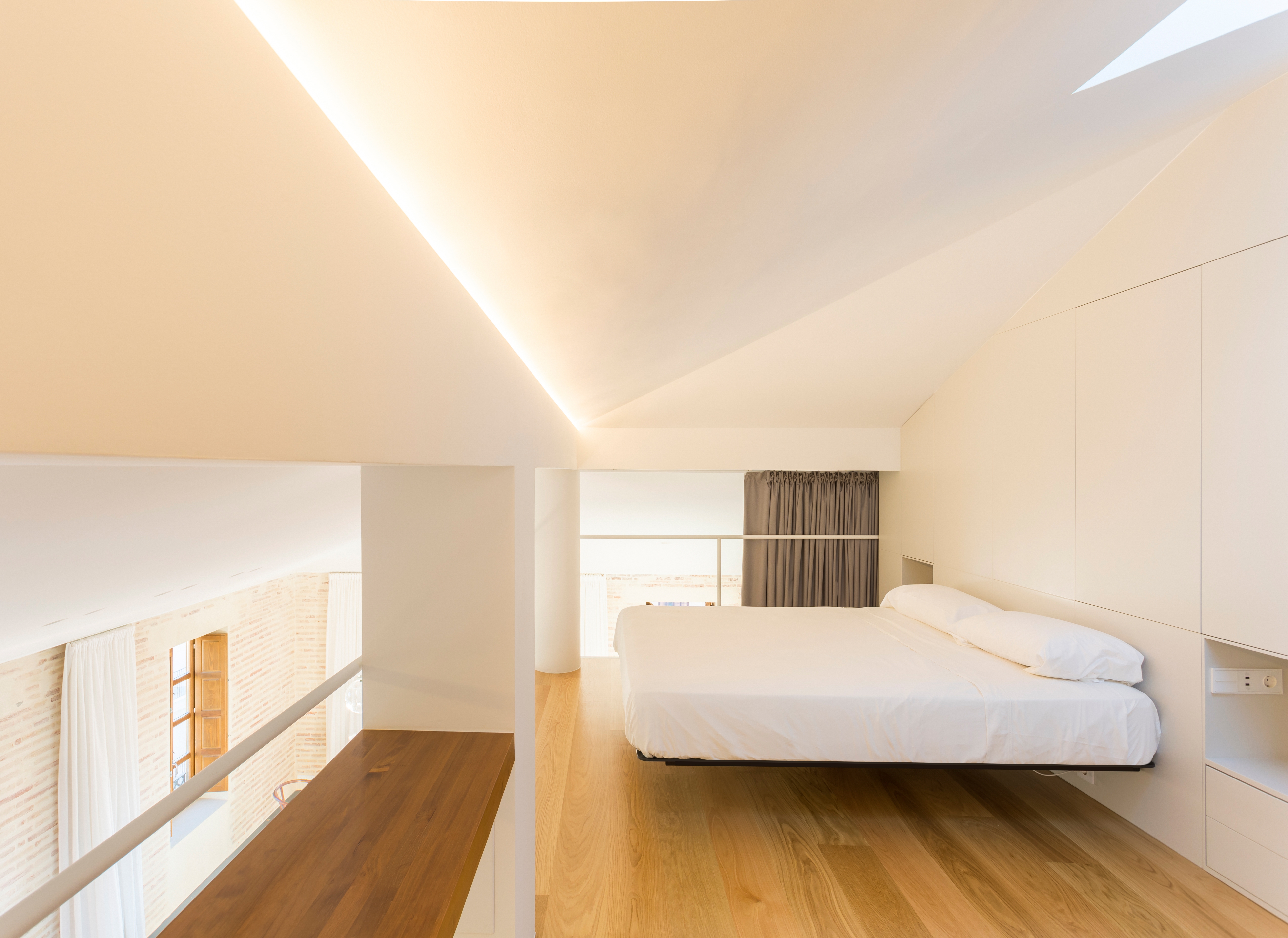A central cube has been conceived as the core element of the design integrating all services within; including kitchen, bathroom, laundry and storage. This central cube also features an integrated folding system that enables the generation of spaces that appear and disappear responding to different needs and uses of the loft. The main access to the loft is through an architectural piece of furniture shaped as a thick wall that integrates facilities and storage inside.