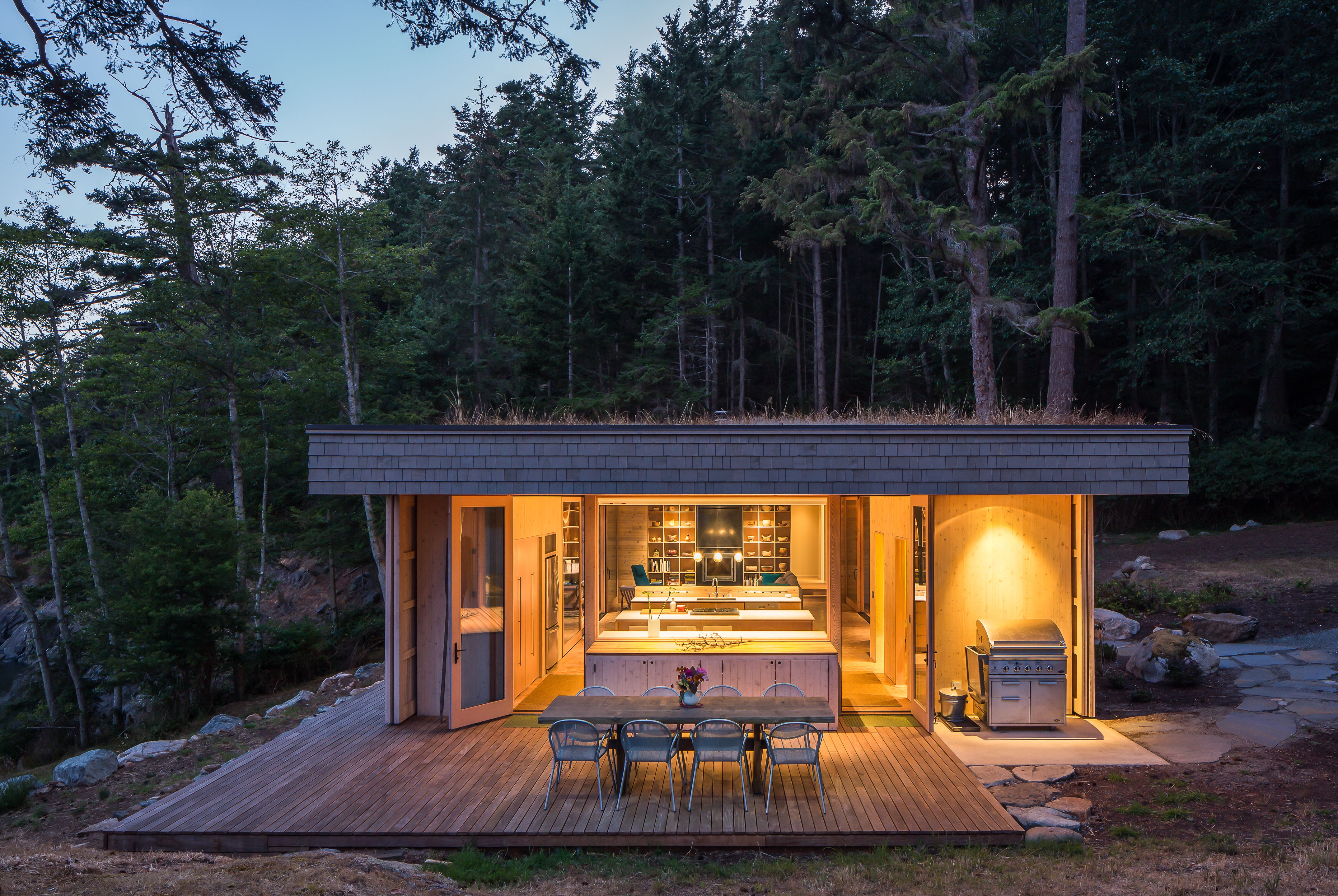 Living spaces open up completely on north (garden) and south (water) sides via a custom lift-slide door system. Bedrooms focus primarily on the more private, forested slope to the west and the kitchen opens onto an adjacent a rock promontory to the east. Due to the extreme weather exposure of the site, major openings are paired with rolling wall panels to protect them from punishing winter storms, as well as to provide security when unoccupied. The finish palette consists of local materials including douglas fir (floors, trim), western red cedar (siding, wall and ceiling cladding) and pacific madrone (furniture).