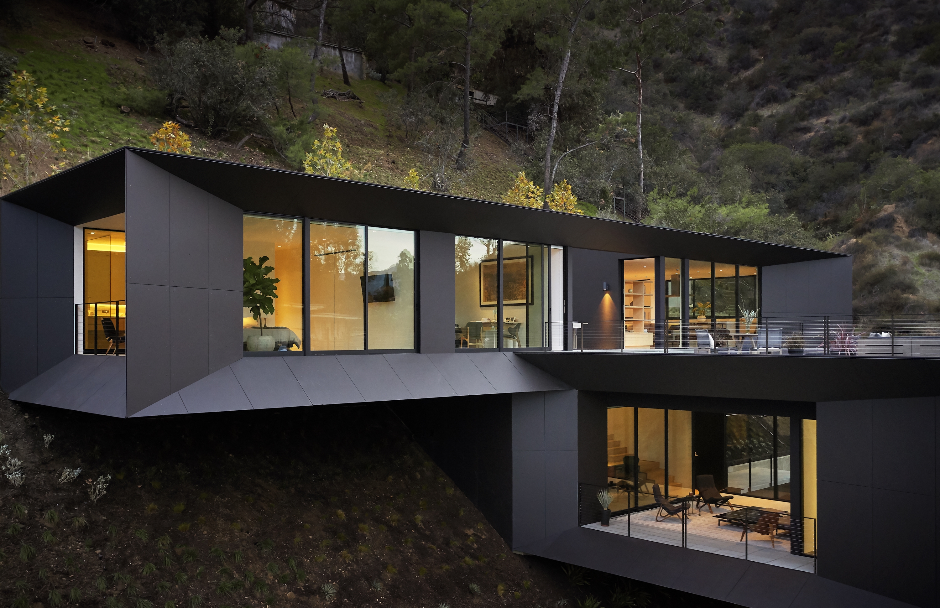 Following the natural grade, the front stairs create an arching path to a bridged entry portal, all the while showcasing panoramic views of the house. As the front door opens, the dark, angular façade of paneled concrete gives way to a light-filled interior of soft wood and bright white finishes. Upon entering, visitors find themselves within an indoor/outdoor living space – framed views of the exterior landscape bathe visitors in natural light and immerse them in the natural world outside. Once inside the residence, stairs descend to a private screening room or ascend to the third floor living spaces. A series of open terraces mirror the interior living quarters, encompassing almost as much outdoor space as the enclosed third-floor footprint.