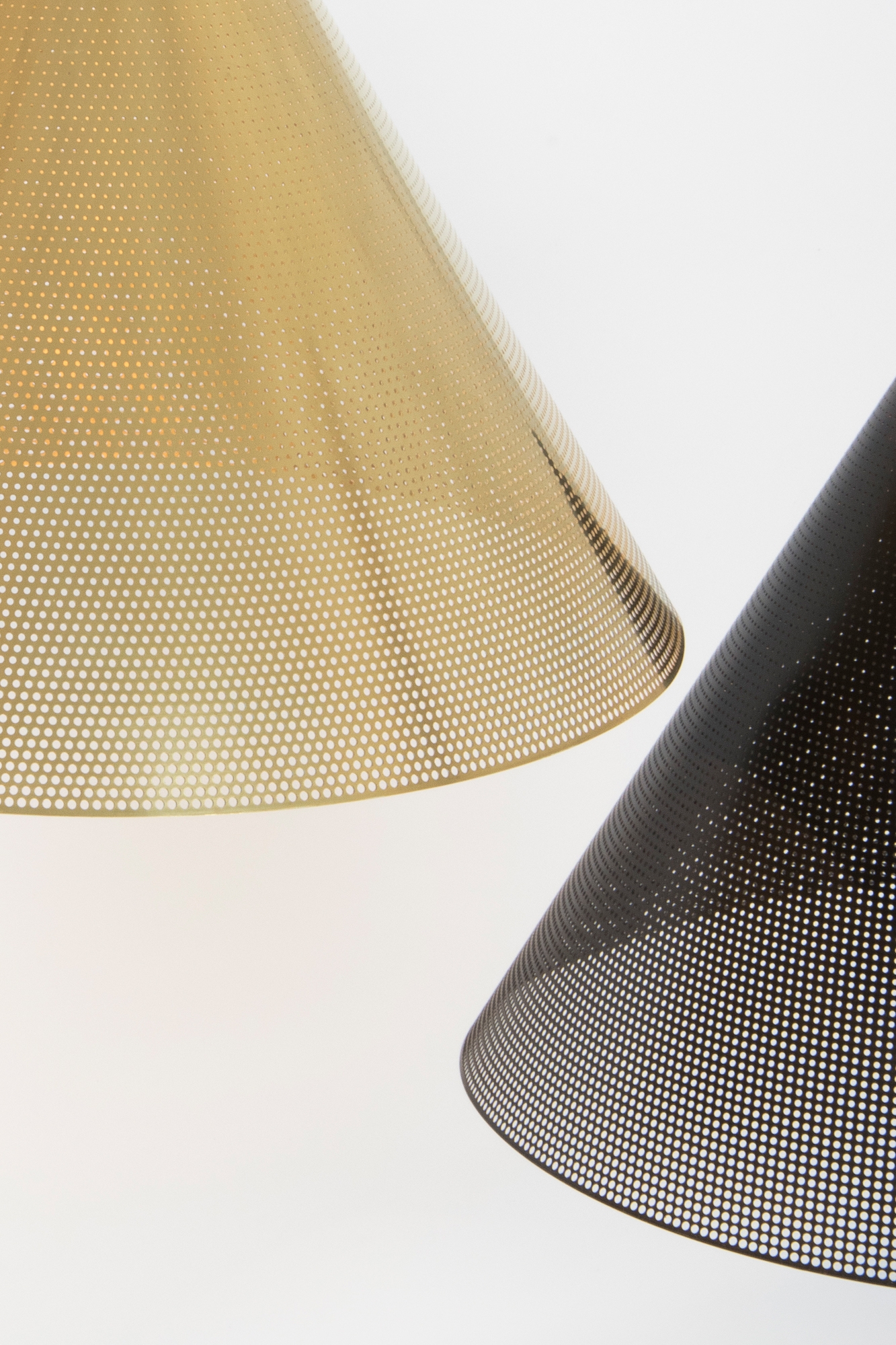 These finely perforated lamps play with the perception of the observer. The lighting objects do not have a clear source of light but instead they just seem to consist of a thin surface and appear to be empty. The surface is almost transparent, making objects behind it visible. The lamps seem to be nothing but a thin shell.