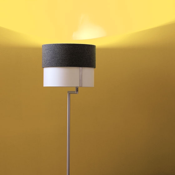 Lumix is a functional floor lamp. Light up a room or bathe it in a gentle, cozy light – Lumix is designed to create a variety of lighting scenarios. The bipartite lumiscent shade holds two bulbs which can be lit individually. Using the shade sensor dimmers Lumix can be transformed from a torchiere to a reading lamp within seconds. Two different shade materials make many lighting types possible. In the upper shade a metal ring can be covered with various textiles. The light is directed upward and becomes visible when reflected by the ceiling or the wall. The lower shade made of off-white cotton directs the light downward, creating a warm, homogeneous lighting.