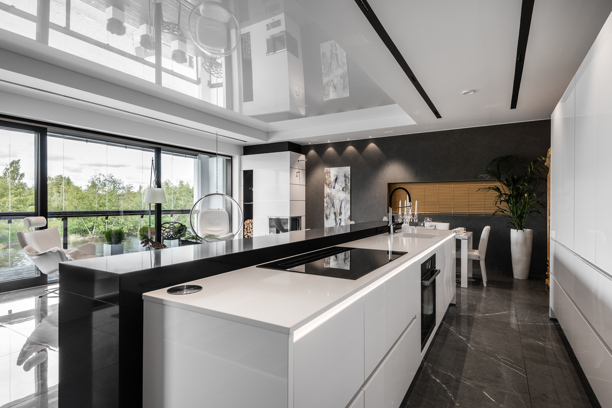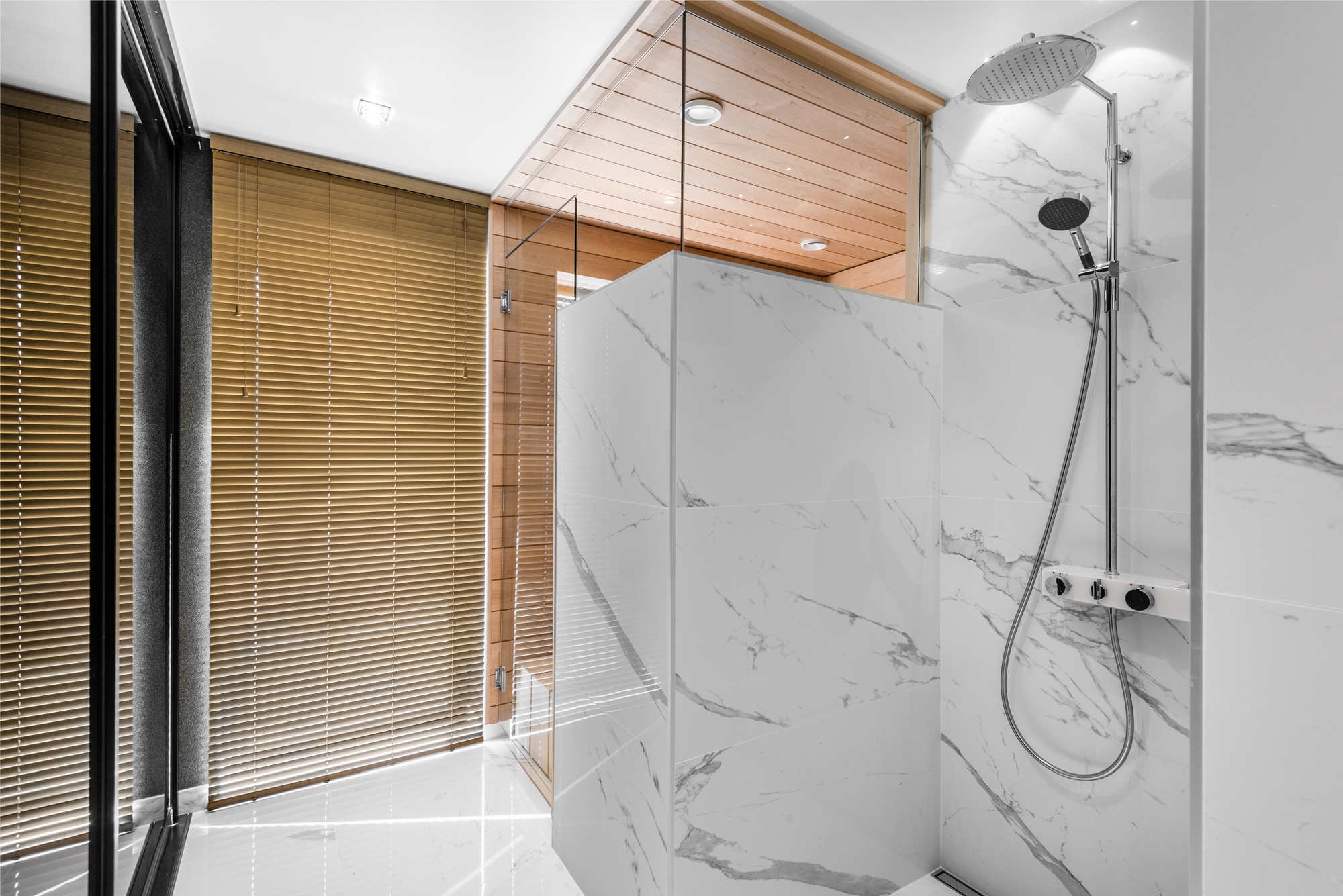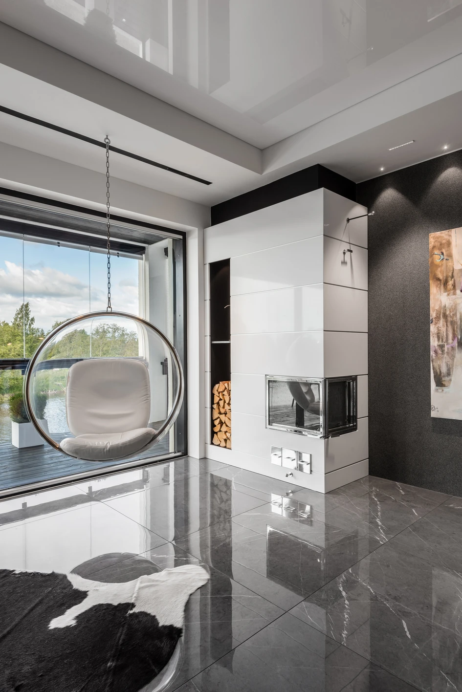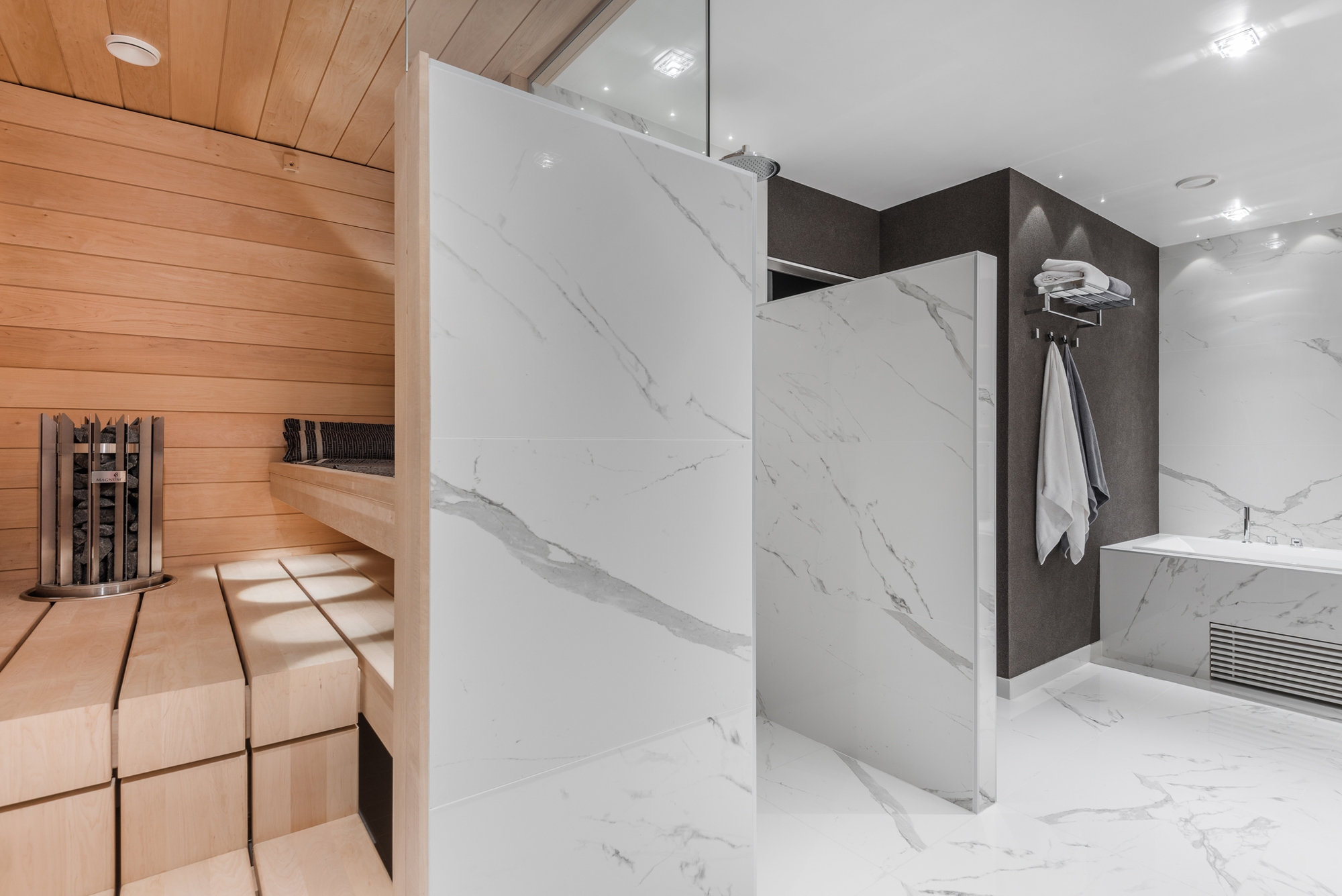 In the spa and bathroom, the designer chose the Statuario Grigio colour, opting for the 90x45 cm (35 5/8"x 17 3/4") format for the flooring and the larger59x118 cm (23 1/4"x46 1/2") format to create dividing walls. Meanwhile, the Grafite colour and 88x88 cm format were chosen for the lounge, bedrooms, corridors, stairs and the utility closet in the spa. During the design phase, Hjelm-Luontola invested a lot of care and attention into choosing the right glossy surface, which she uses for both the porcelain stoneware flooring and walls and in the kitchen, where the surfaces reflect the light, creating a sense of continuity throughout the home. Indeed, the name ‘Lux Line’ came about from this desire to express this concept.