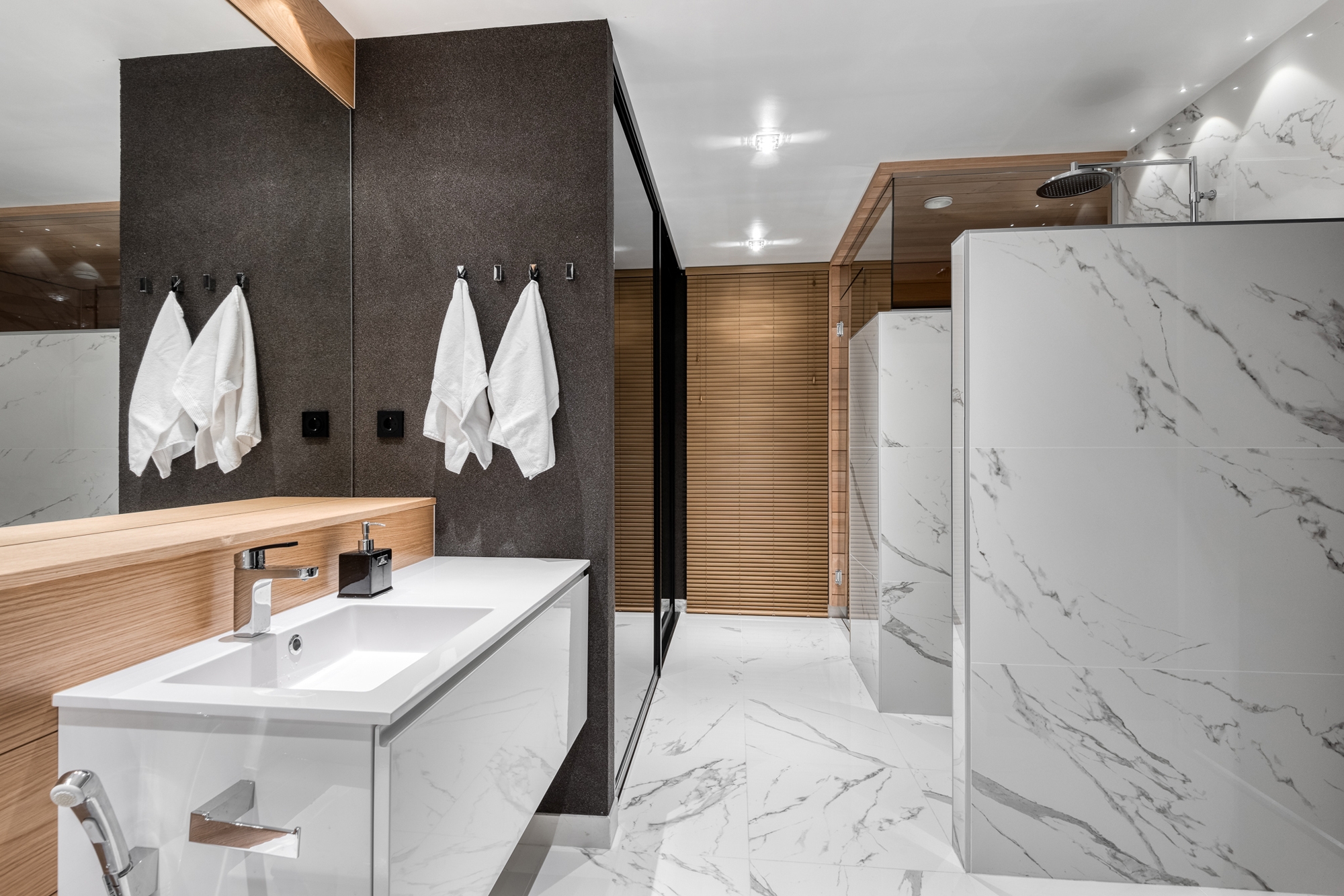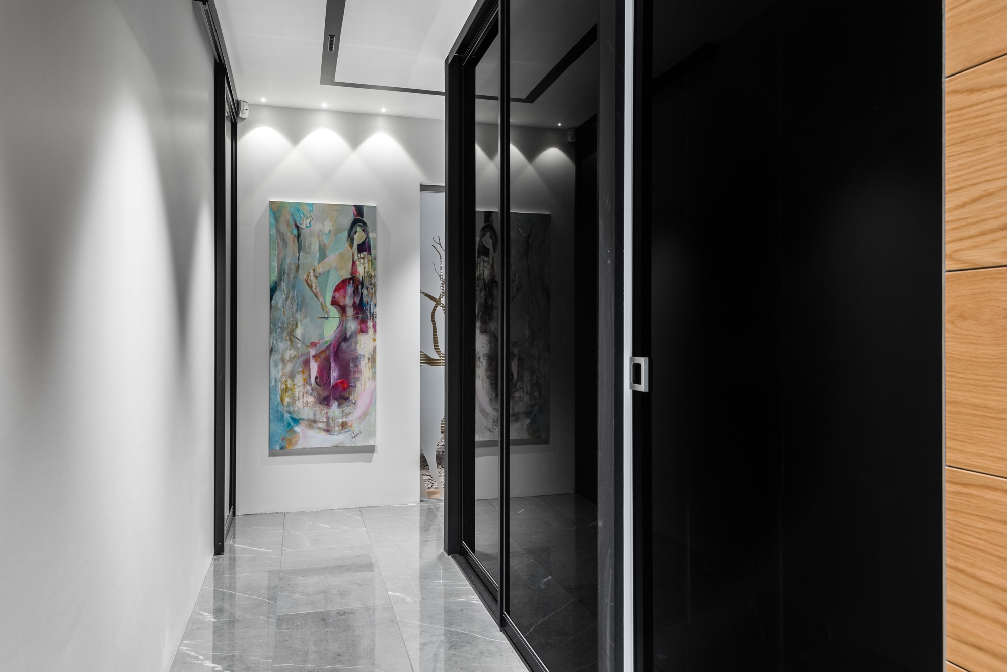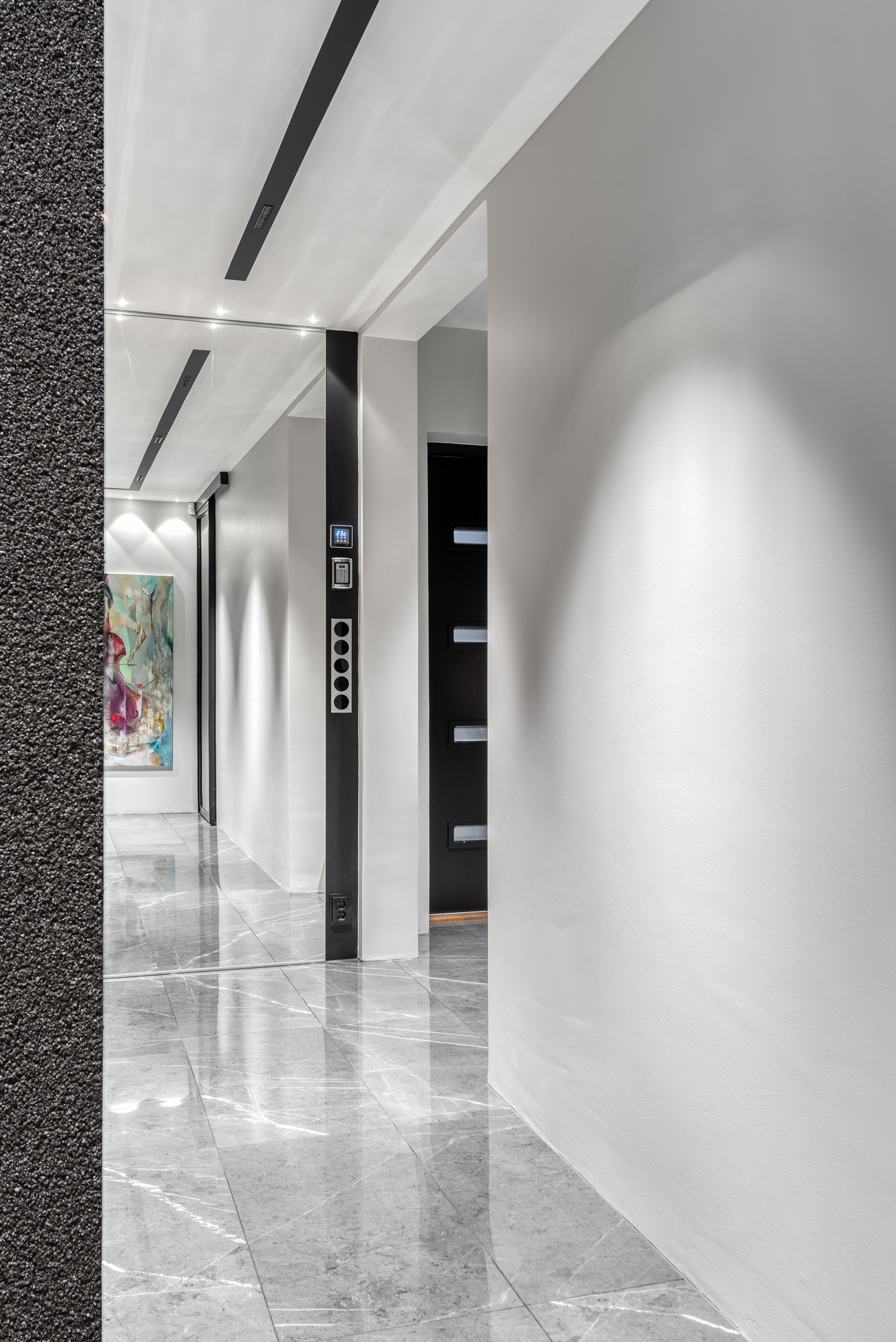 In the spa and bathroom, the designer chose the Statuario Grigio colour, opting for the 90x45 cm (35 5/8"x 17 3/4") format for the flooring and the larger59x118 cm (23 1/4"x46 1/2") format to create dividing walls. Meanwhile, the Grafite colour and 88x88 cm format were chosen for the lounge, bedrooms, corridors, stairs and the utility closet in the spa. During the design phase, Hjelm-Luontola invested a lot of care and attention into choosing the right glossy surface, which she uses for both the porcelain stoneware flooring and walls and in the kitchen, where the surfaces reflect the light, creating a sense of continuity throughout the home. Indeed, the name ‘Lux Line’ came about from this desire to express this concept.