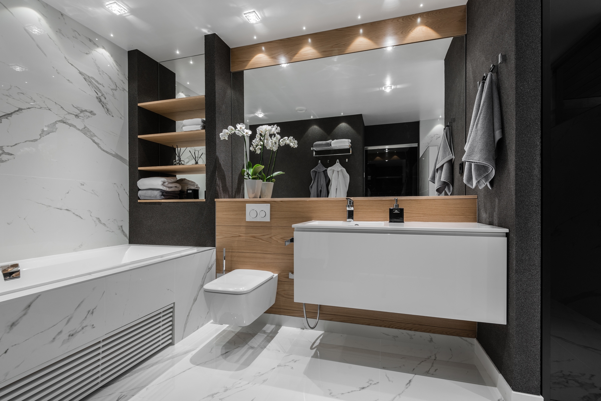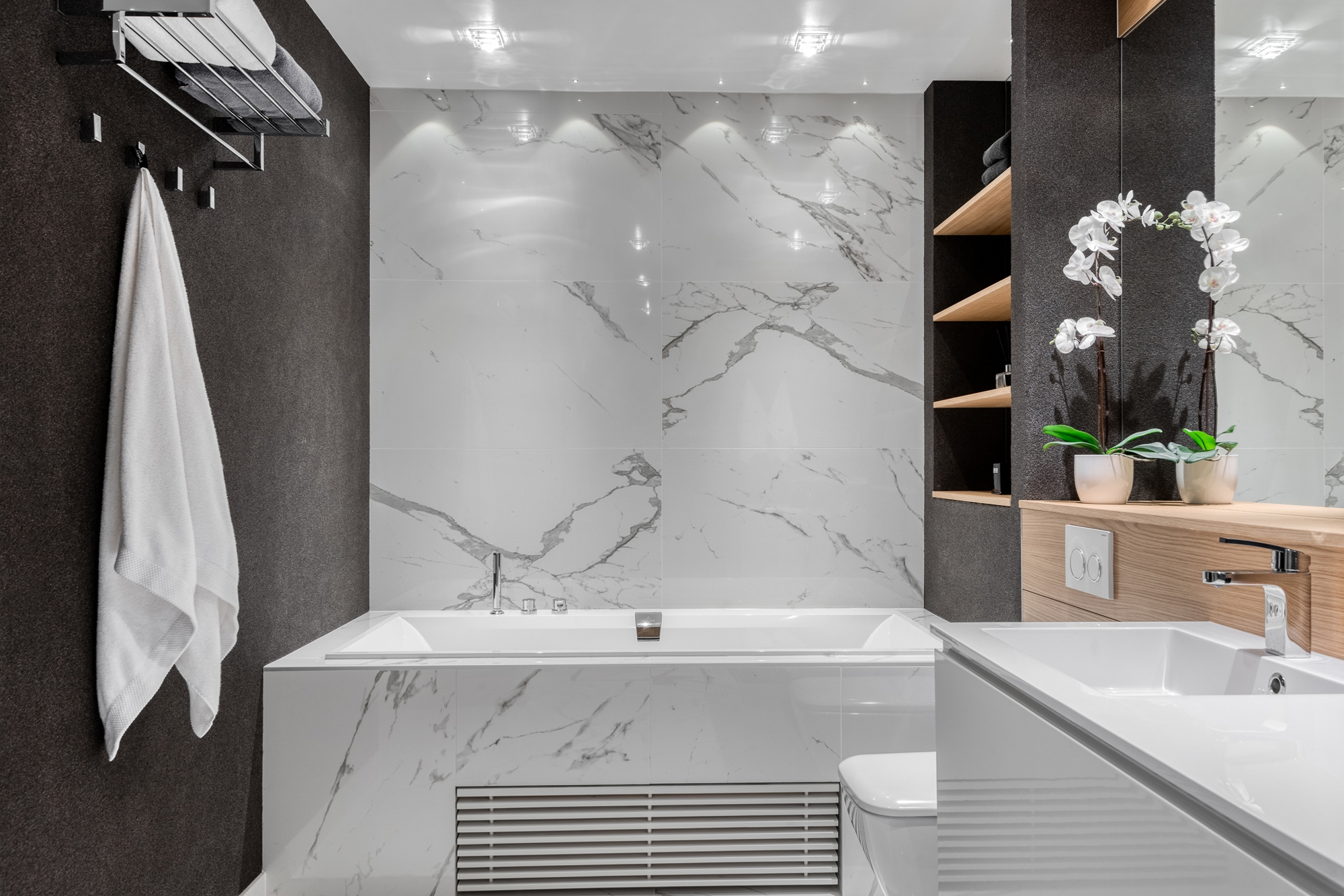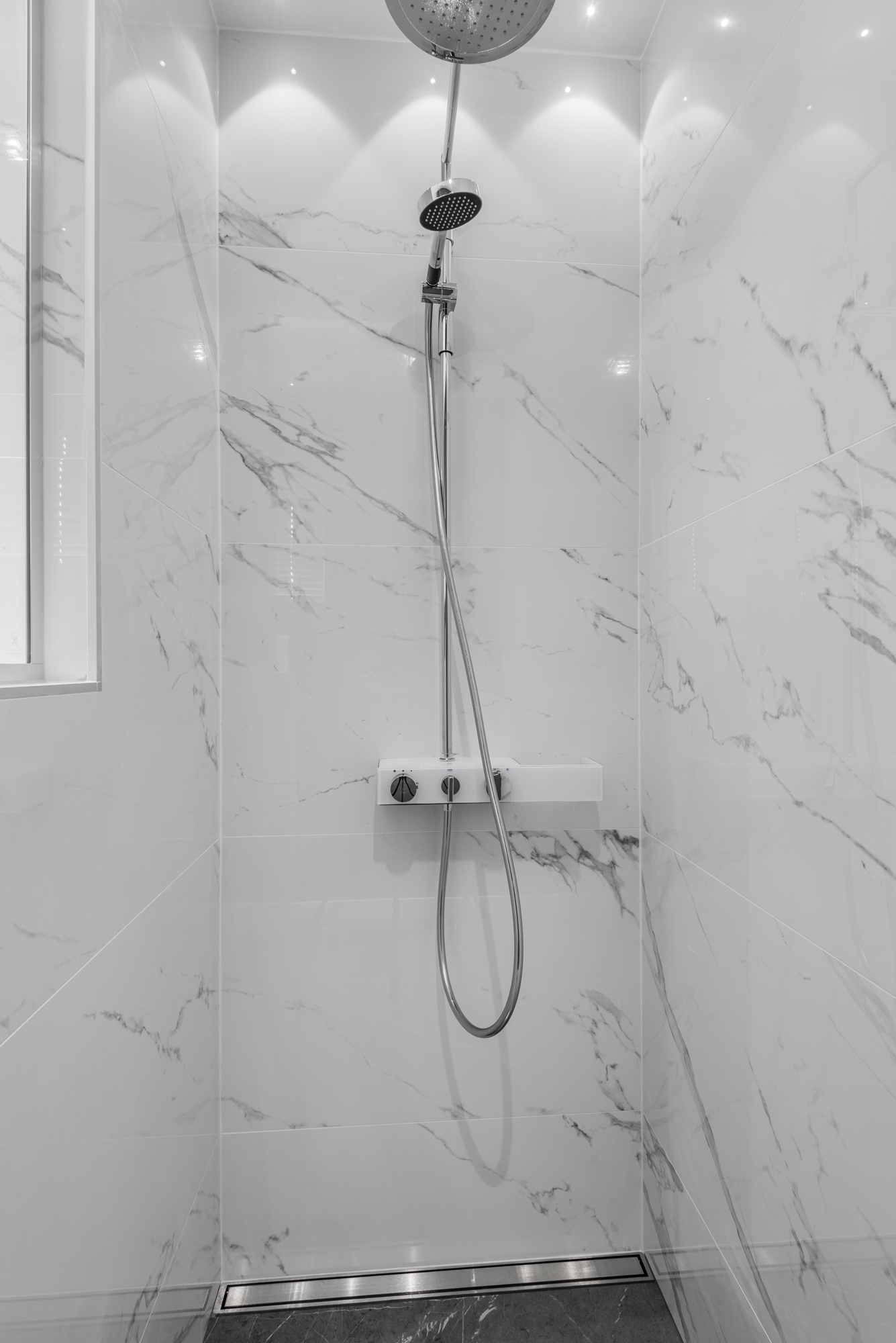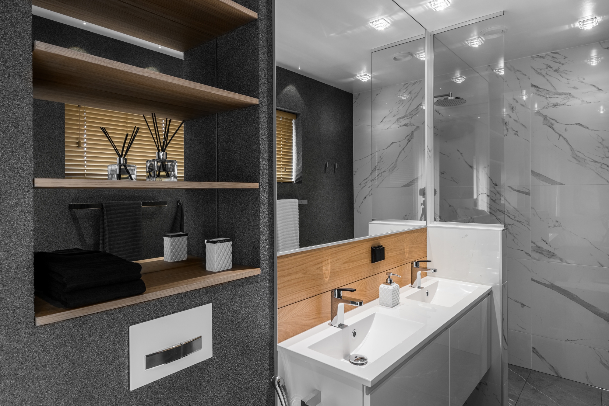 In the spa and bathroom, the designer chose the Statuario Grigio colour, opting for the 90x45 cm (35 5/8"x 17 3/4") format for the flooring and the larger59x118 cm (23 1/4"x46 1/2") format to create dividing walls. Meanwhile, the Grafite colour and 88x88 cm format were chosen for the lounge, bedrooms, corridors, stairs and the utility closet in the spa. During the design phase, Hjelm-Luontola invested a lot of care and attention into choosing the right glossy surface, which she uses for both the porcelain stoneware flooring and walls and in the kitchen, where the surfaces reflect the light, creating a sense of continuity throughout the home. Indeed, the name ‘Lux Line’ came about from this desire to express this concept.