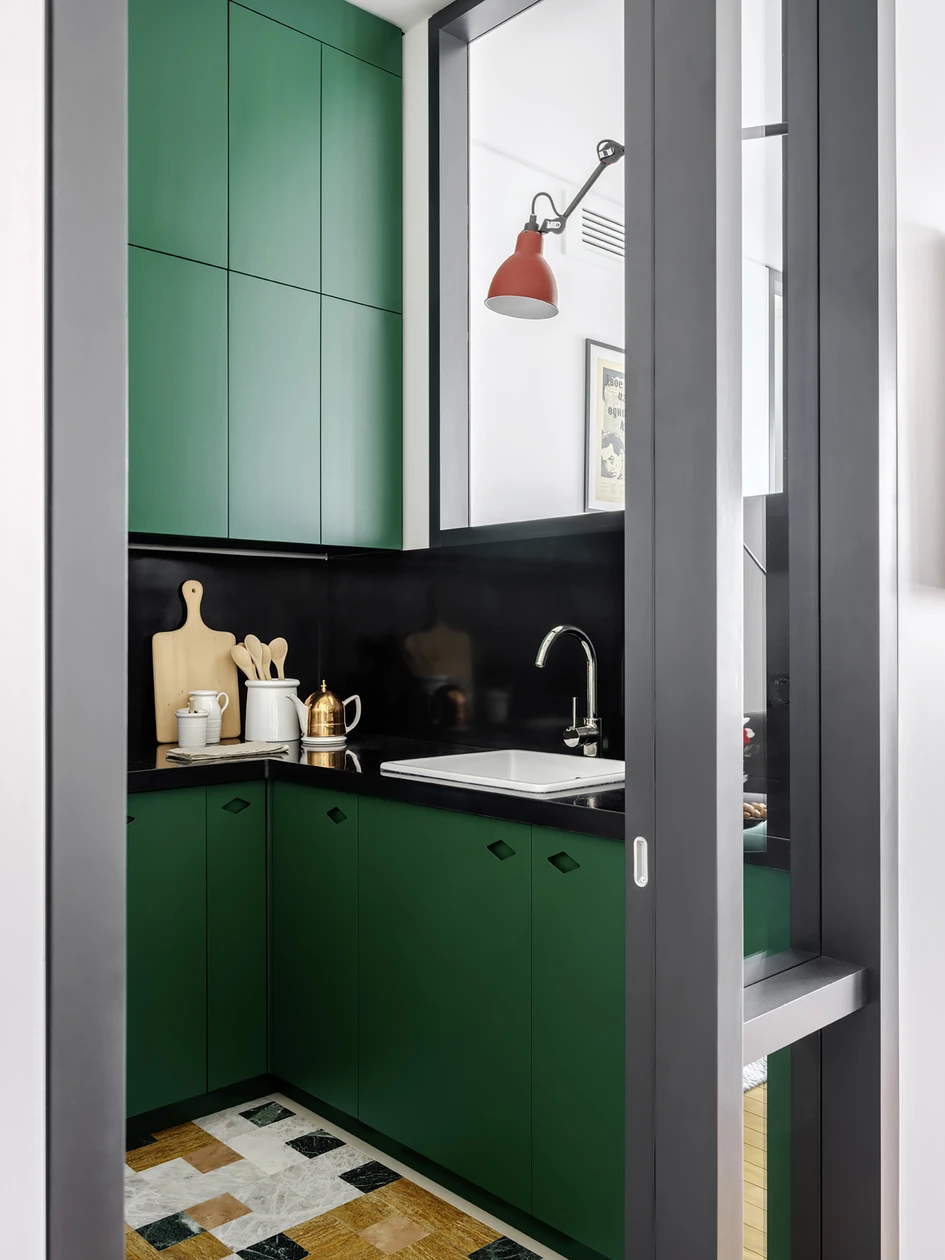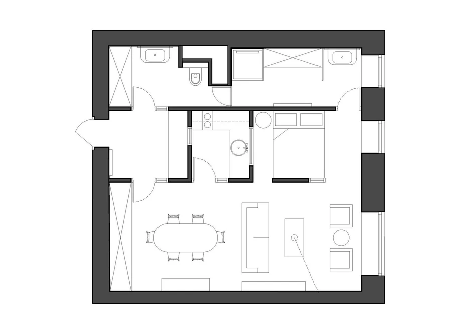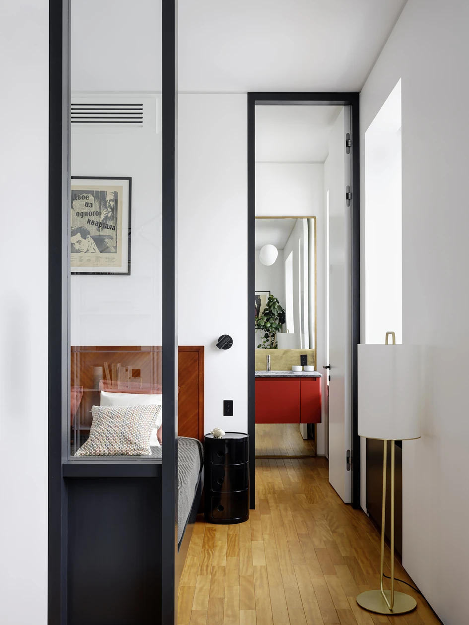 It is a typical bachelor pad suited for one or two people, and this inspired us to make the light from the three windows penetrate into all the rooms creating a totally translucent space. We decided to move the kitchen area into the centre of the flat with the light coming from transom windows on two opposite sides: one is looking out on a room window while the other – on the entrance door. Thus, the day light from the room window gets through into the entrance hall. The interior doors with transom windows are another architectural element adding to the translucence of the space and turning an ordinary interior door into a portal.