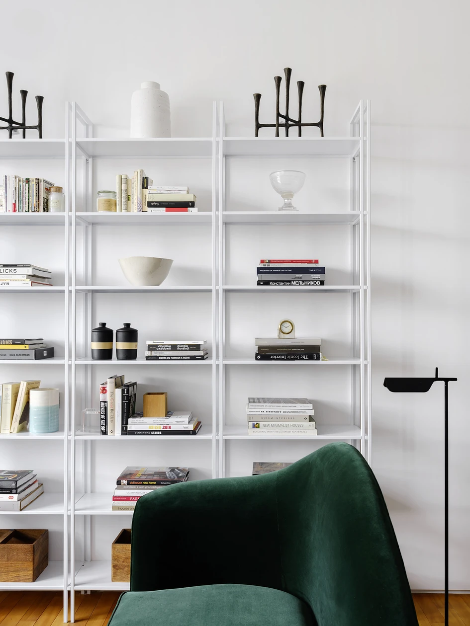 All elements of the decoration were selected with great care to leave only what was strictly necessary and avoid anything superfluous. To make a white flat with a lot of light cosy and snug we chose an unusual kind of wood floor boards made of African teak (Iroko). The wood floor undertones give warmth to the strict architecture of the portal-like interior doors, apertures and white mass of the walls.