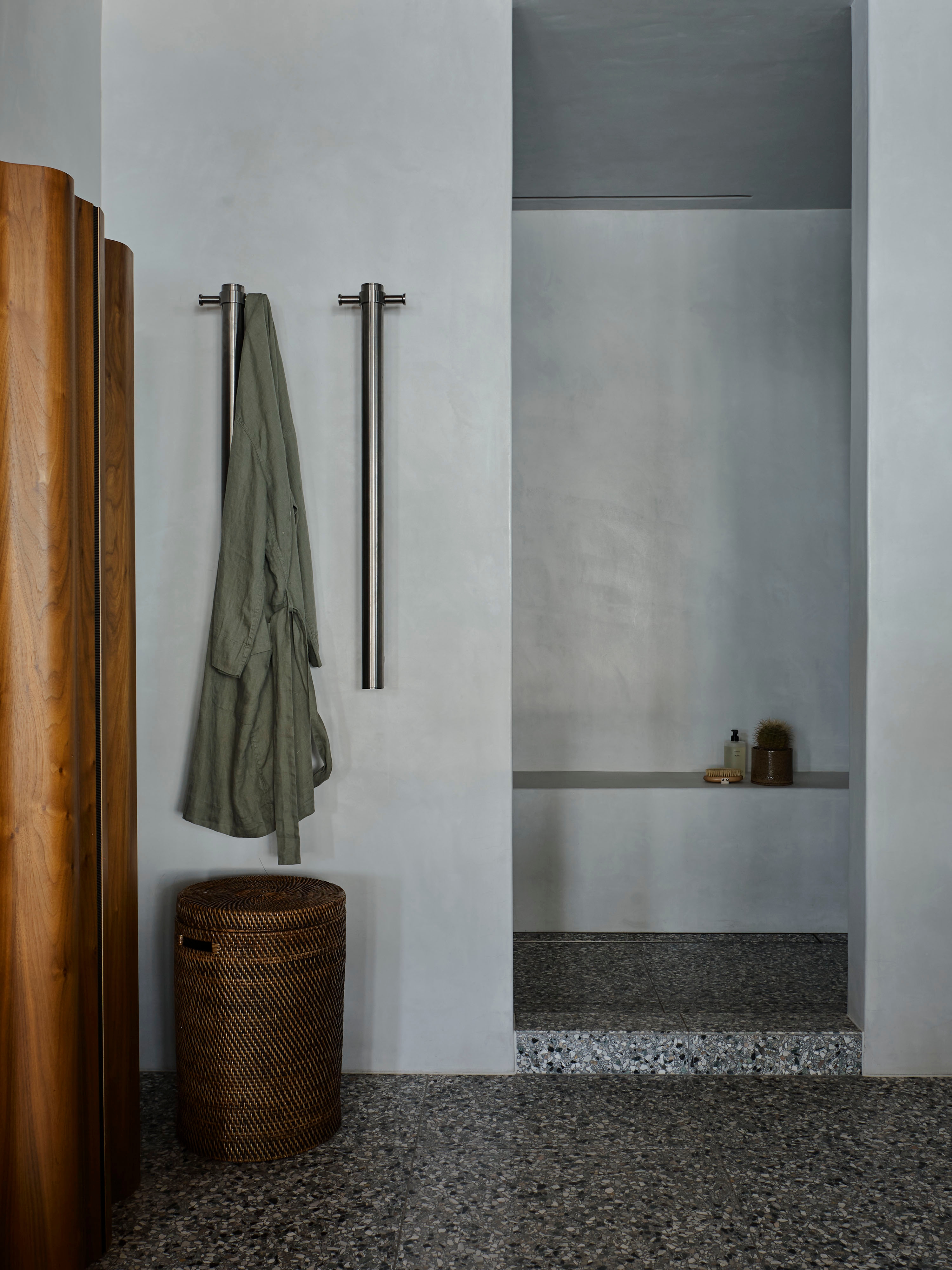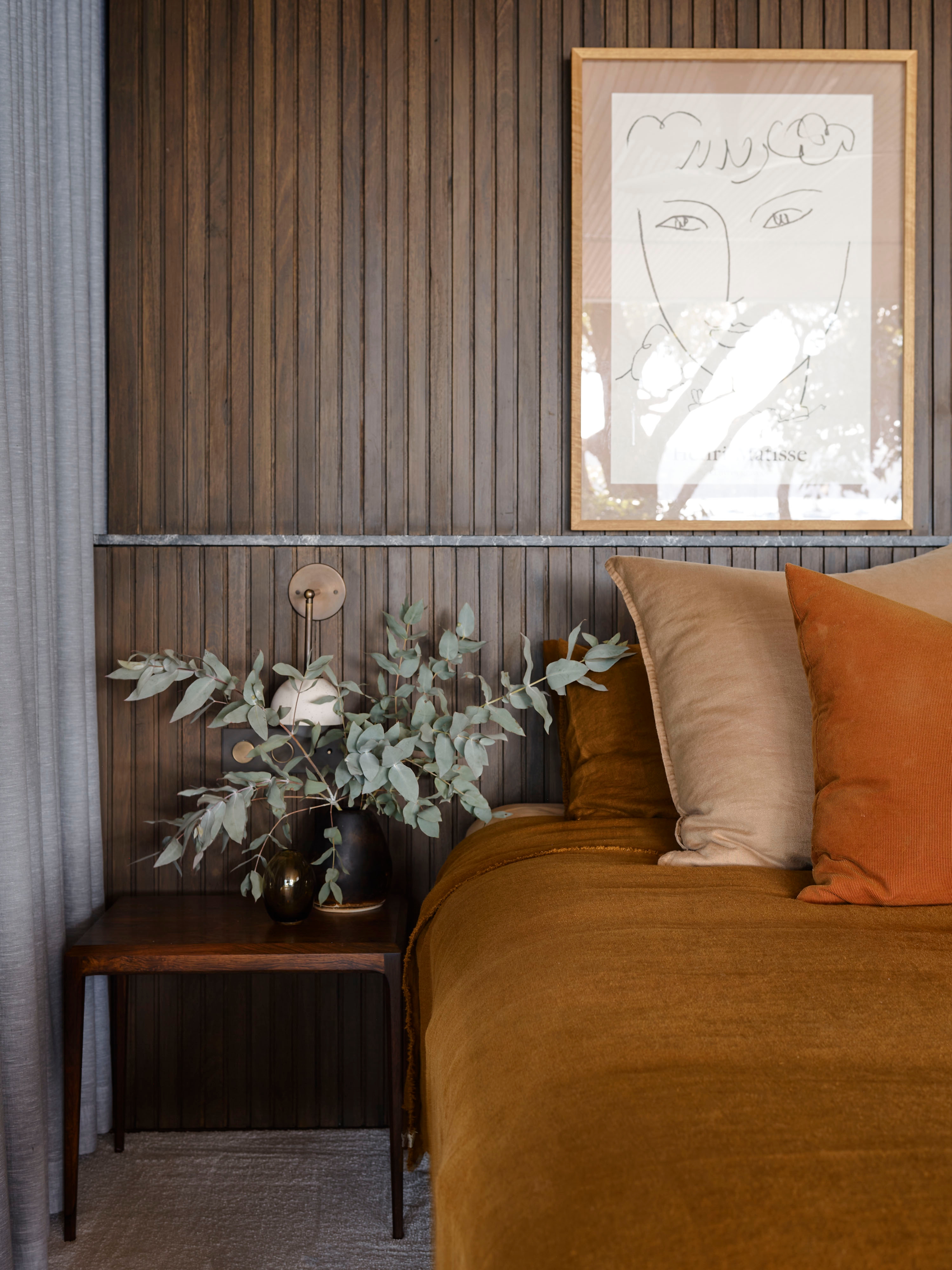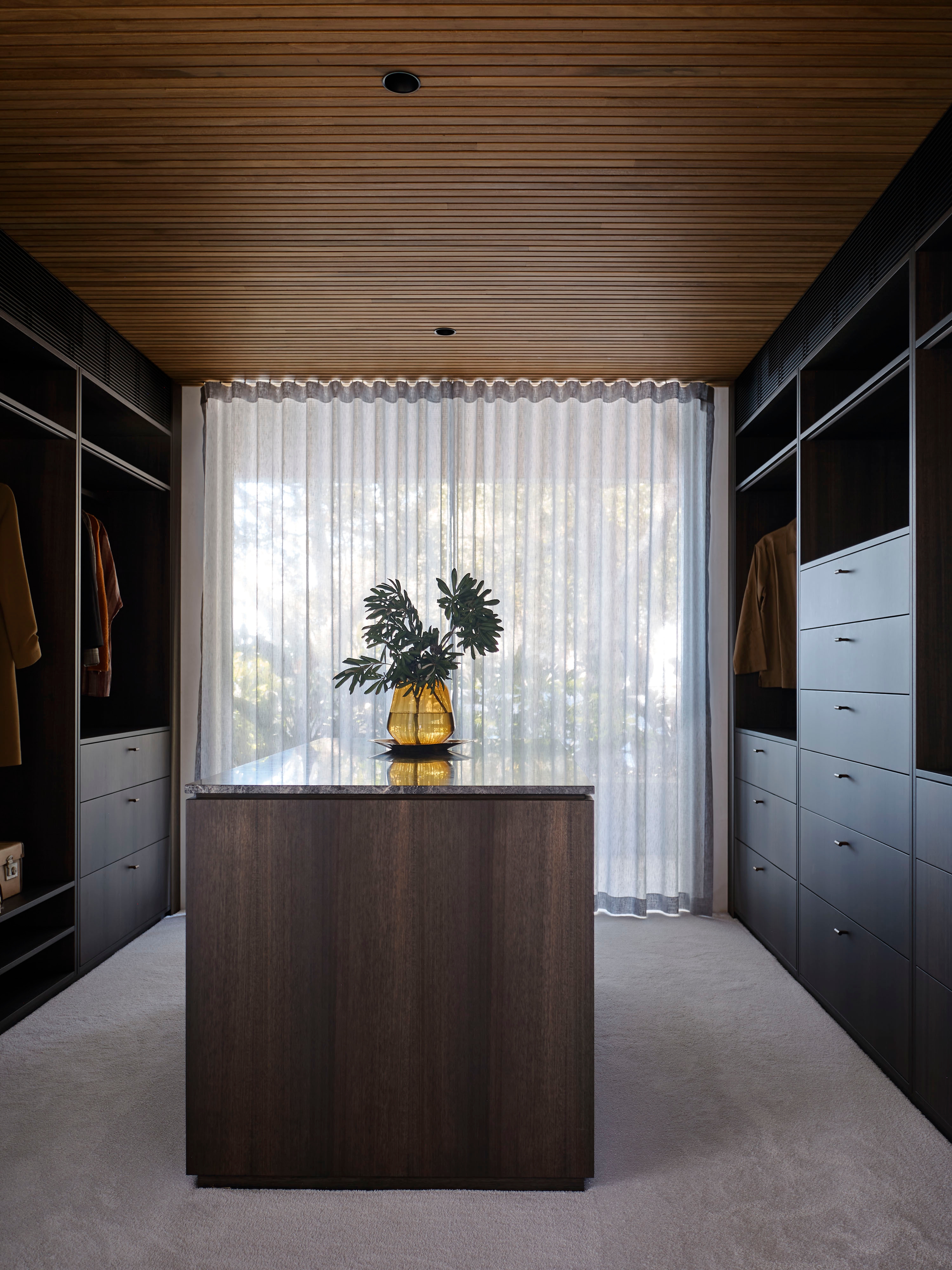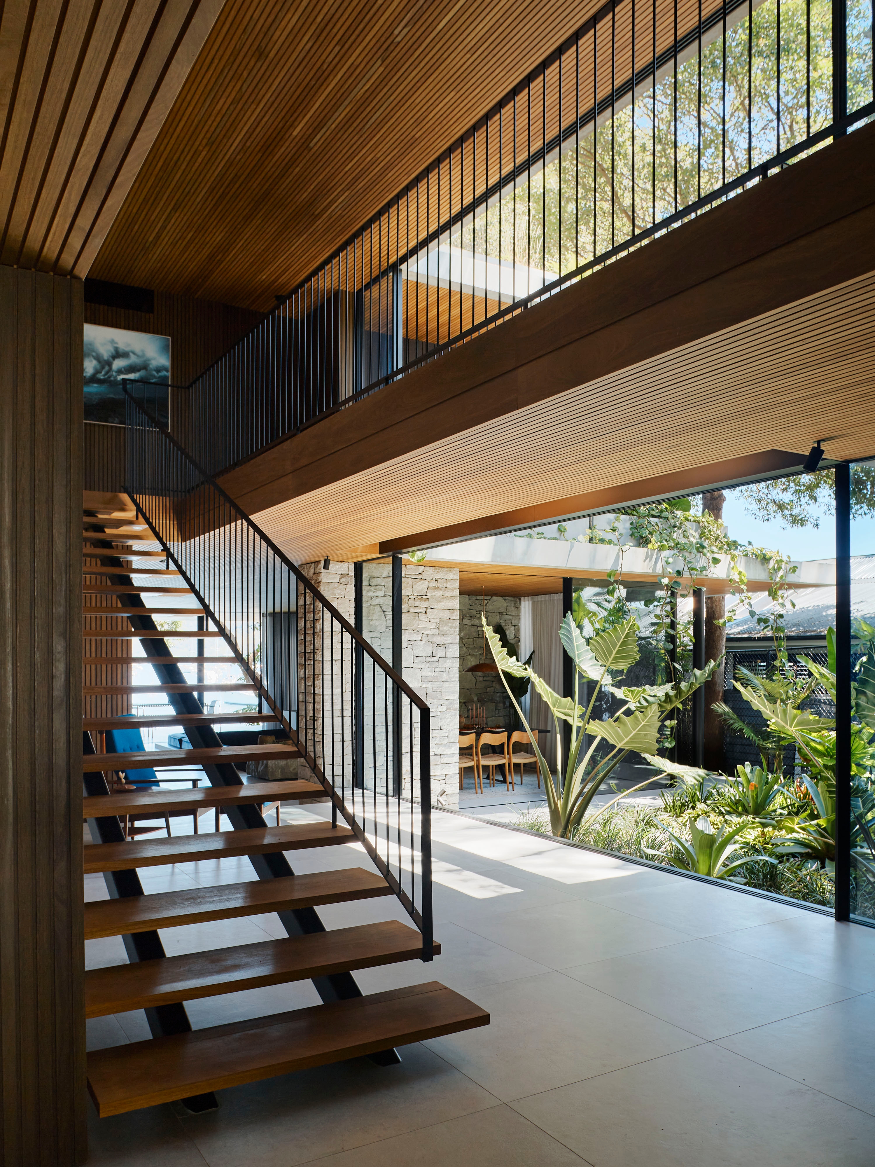 The feeling of being outside yet still being sheltered by a formative structure was key – this is where we played with the idea of hard and soft. Hard is represented in the Brazilian modernist design with concrete, stone and tallowwood. The result is a solid structure with large eaves creating a safe shelter in which to recede.