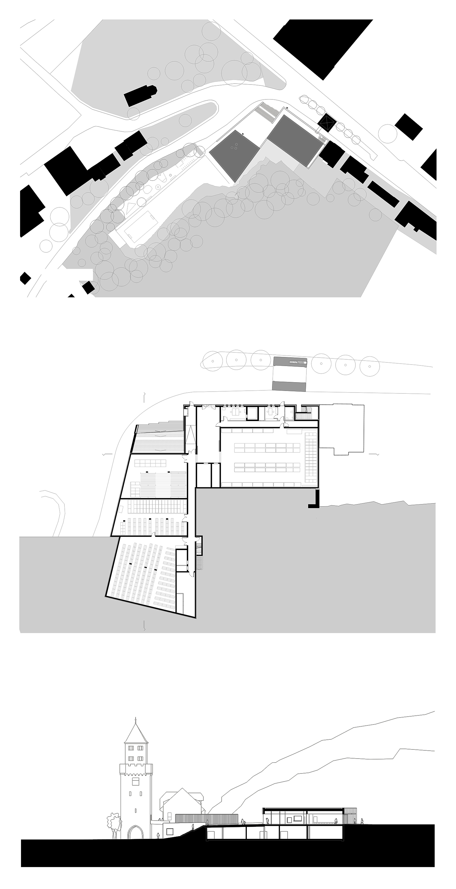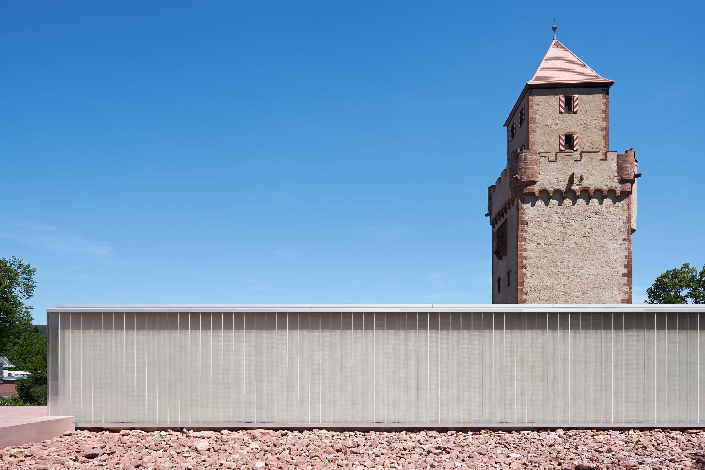 The new Museum Depot, City Archive and Youth Center are located on a slightly descending lot which was previously occupied by a car dealership, abandoned many years ago. This position at the foot of Castle Hill is particularly characterised by its direct adjacency to the historically listed building “Mainzer Tor”, which was constructed at the end of the 14th century as the western city gate to Miltenberg.