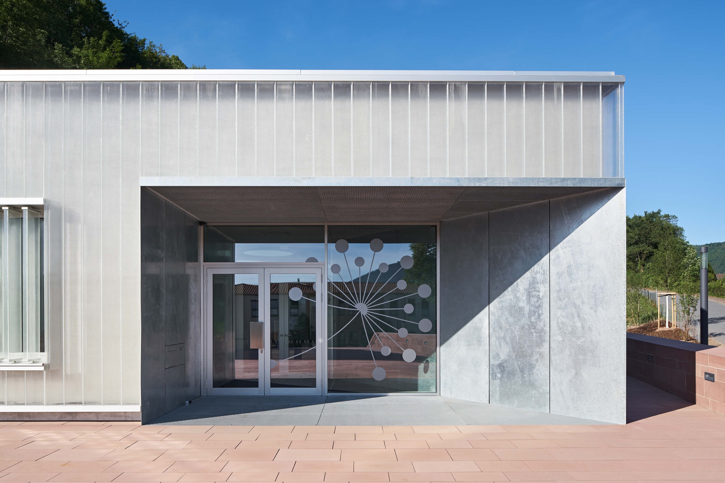 The wide exterior staircase leads from Mainzer Strasse up to the roof surface of the depot which forms a small public plaza, framed by the two single-storey cast glass buildings. Entry to the youth center in the southern body takes place directly from here. Wheelchair access is possible from Monbrunner Strasse. The generously glazed event space of the youth center orients itself towards the rearward quarry wall and the newly designed outdoor area. From the plaza and via a new bridge, the adjacent “Mainzer Tor” can be accessed and be experienced as the entrée to the city.