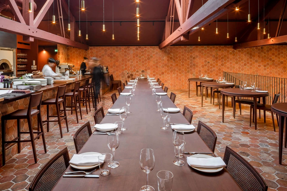 The restaurant’s name "Maison", mean "house" in French, which is also its theme. The furniture was custom-made for the restaurant from designs based on their ready-made furniture. All of the furniture on the second floor has colours custom-created to match the floor and ceiling terracotta. The 8m custom-made table, an essential element of Maison as the table d'hôte, is achieved by connecting two 4m pieces of solid ash. Time & Style made full use of manufacturing technology to give life to the vision of the architects and chefs.