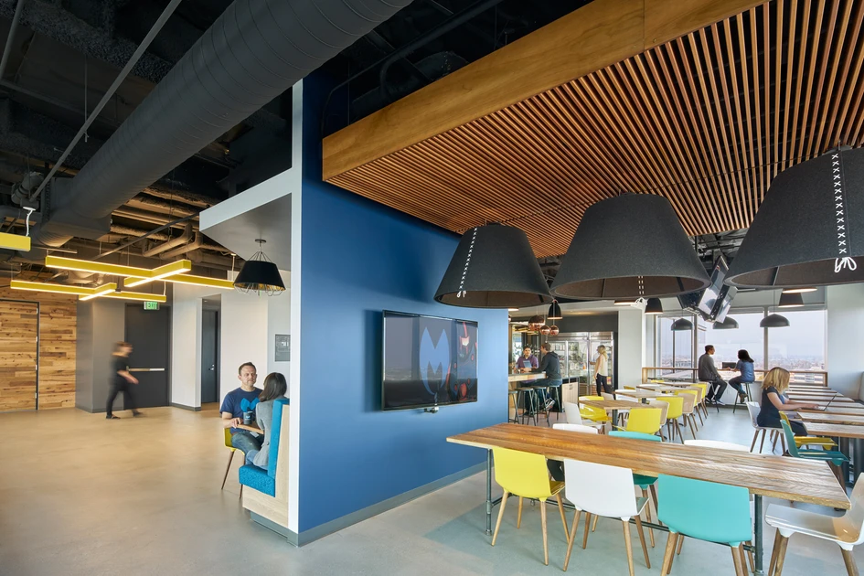 The textured carpet, wall coverings, and custom colored light fixtures create a layered sophistication with every surface thoughtfully considered. Bright colors in blue and yellow against a neutral black background and organic wood elements stand in contrast to natural light coming in from the large windows around the entire building perimeter with incredible views throughout. The steel, copper, stone, marble and ceramics in the cafe and all-hands area add various textures and layers creating a sophisticated and grown-up ambiance.