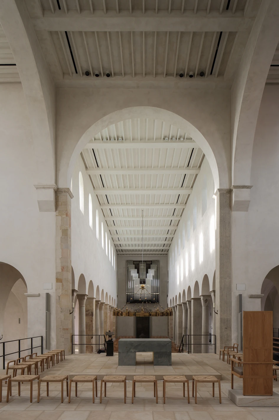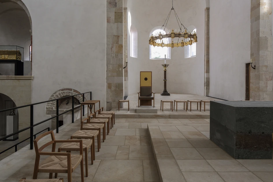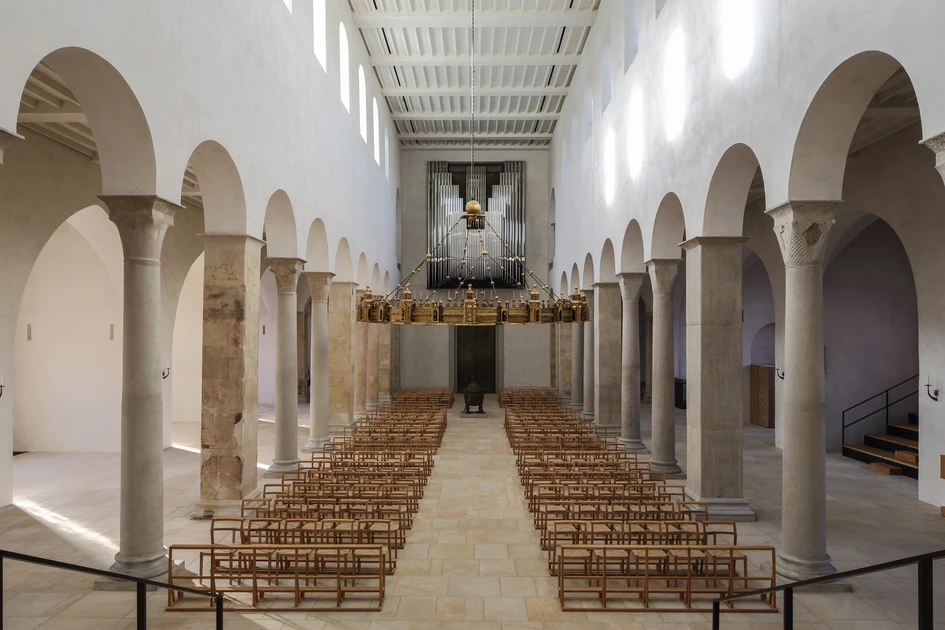 The complex measures within the individual buildings include the architectural reinterpretation of the rooms and materials, the liturgical and contemporary reorganisation of the cathedral, the axial repositioning of the cultural treasures (bronze door around 1015, baptismal font around 1322, Hezilorad chandelier around 1054, azelin chandelier around 1044, Christmas column from 993 - 1022) and the installation of a new bishop's crypt below the nave.