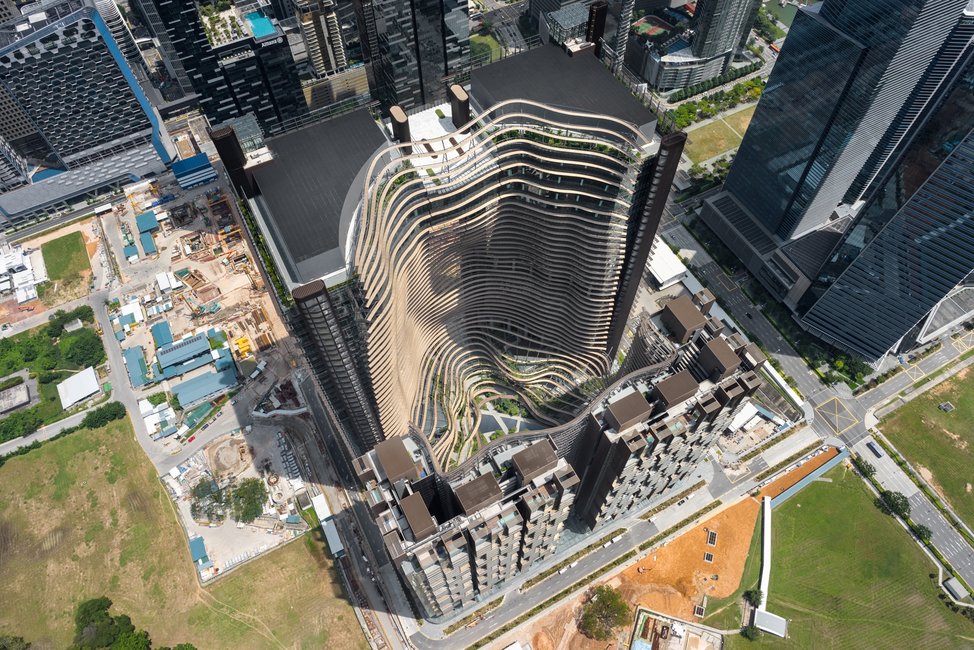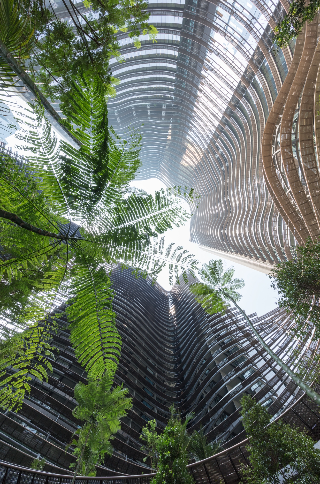 The organic shape of the building complex with its iconic louvres, and the generous planting, contribute to an improvement of the microclimate and increase biodiversity. Inspired by Asian paddy feld terraces, the green center formed by the four towers—with its multi-story three-dimensional gardens—reflects the diversity of tropical flora and creates a new habitat. This Green Heart comprises over 350 different types of trees and plants, including 700 trees, on a landscaped area of 37,000 square meters. Various types of animal become part of this biological diversity. Inspired by the natural climate changes at the different vertical levels of a rainforest, the landscape architecture mimics a green valley with its variations in climate according to level. Restaurants and cafés, retail areas, a ftness club, pool, supermarket, food court, and event areas on the different open terraces not only provide products and services to the residents, offce workers, and visitors—they also create a place for social interaction.