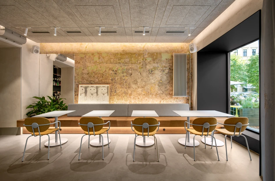 The ceiling was covered with original shingles – out of respect for the residents of the house, we decided to leave this finish and cover it with acoustic panels, which increased the restaurant’s sound insulation. This reduced the ceiling height, prompting us to devise built-in solutions. As a result, the ceiling is not adjacent to the walls along the perimeter, and, with the help of lighting, it appears to float in the air. The pointing is unique – it recreates the facade's pattern: we used it alongside the windows, divided it into segments, and reproduced it as decorative seams. In this way, we honored the history of this building and welcomed it inside. A separate challenge was installing the ventilation system, which we concealed behind grilles. It needed to be as compact as possible to avoid disrupting the vision of the facade geometry. That's why we decided to integrate track lights into the cladding and free the ceiling from overhead lighting.