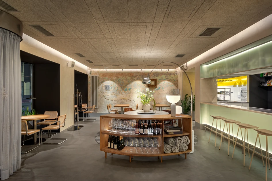 To avoid the complete symmetry of the seating areas in the restaurant, as opposed to the banquette against the right wall, there are tables with four chairs on the left. There is a shelf along the wall, where one can conveniently place a bag or personal items; it extends the high skirting board that decorates the entire room. The idea is that, over time, the space will evolve, much like a lived-in apartment, gradually filling with books, magazines, plants, and paintings displayed on the shelf.