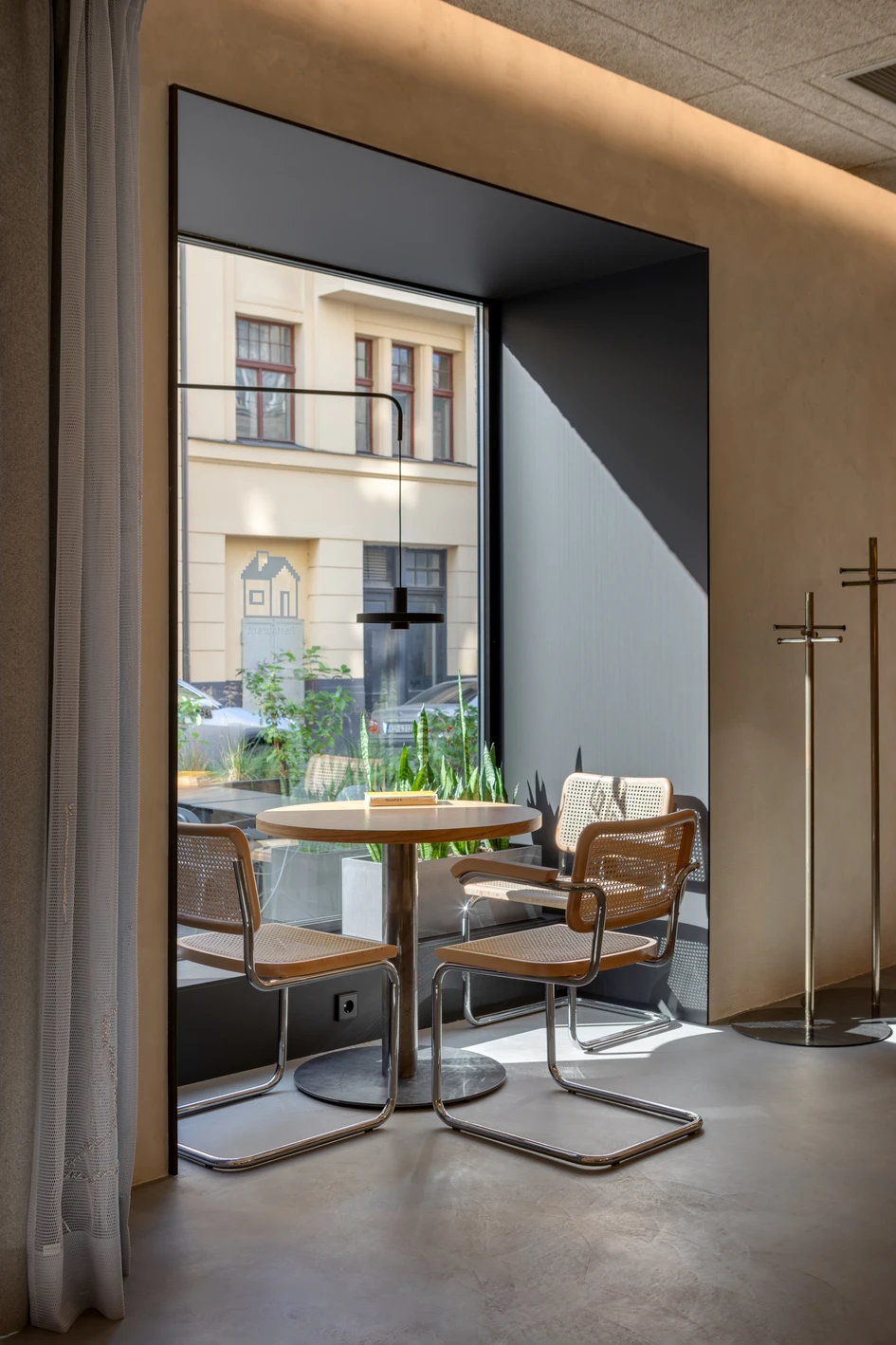 To emphasize the room’s geometry, dark panels were added to the inside of the window arches – all three windows of the restaurant are the same size. In the two windows to the left of the entrance, the seating is symmetrical – tables with three Cesca chairs and Cesca armrest chairs by Marcel Breuer. The bases of the tables and hangers in this area are made of bare, scratched steel by the Ukrainian brand propro, and match the original imperfect plaster to create the effect of time interacting with the furniture.