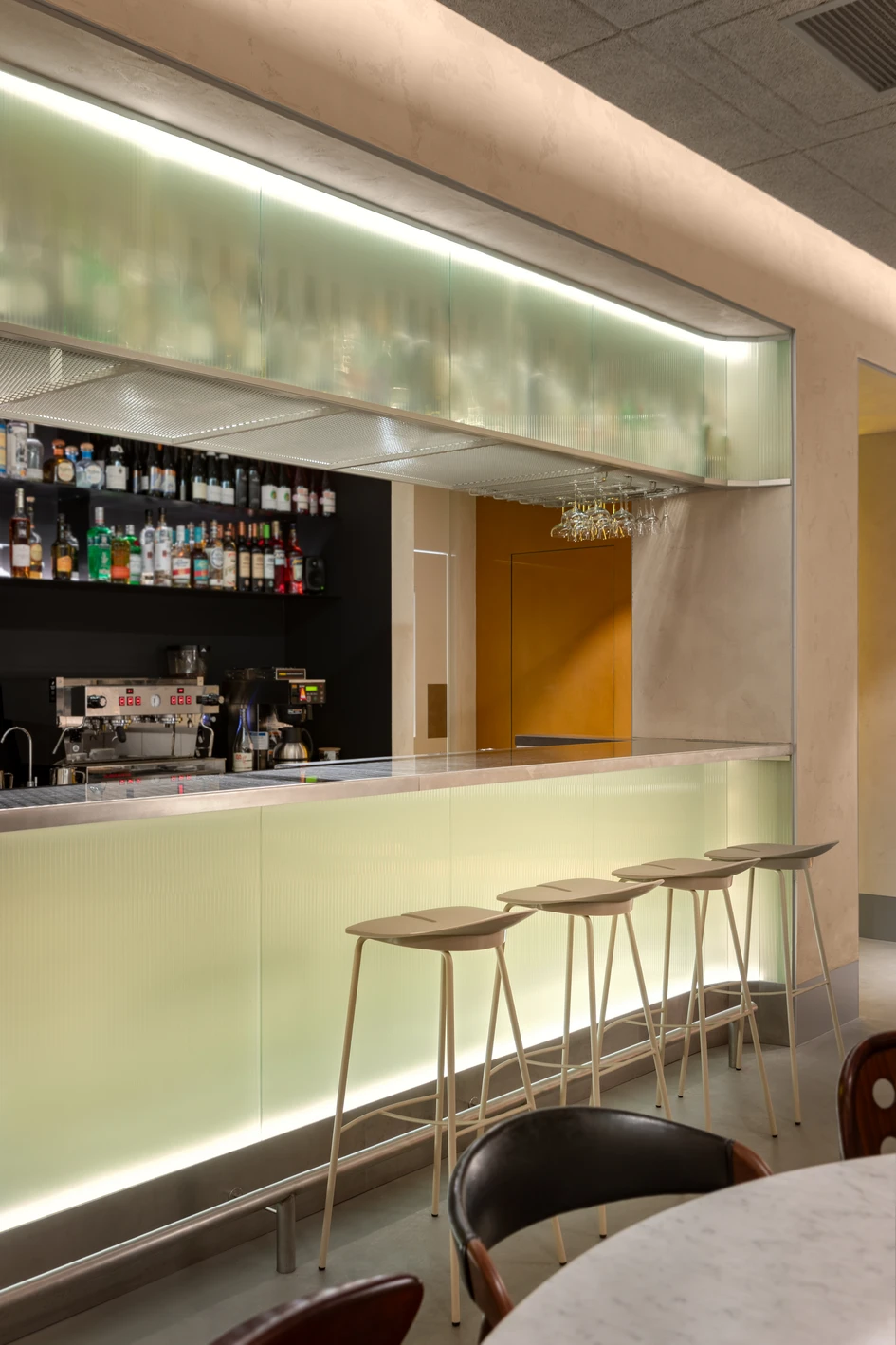 To the left of the bar is the serving area, with its countertop and inner bar made of stainless steel, as well as a custom-made side station next to it. The yellow partition in this area visually echoes the yellow accents found throughout the main hall, including the yellow glass blocks of the bathroom. It also separates the cold light needed for the operational area of the kitchen.