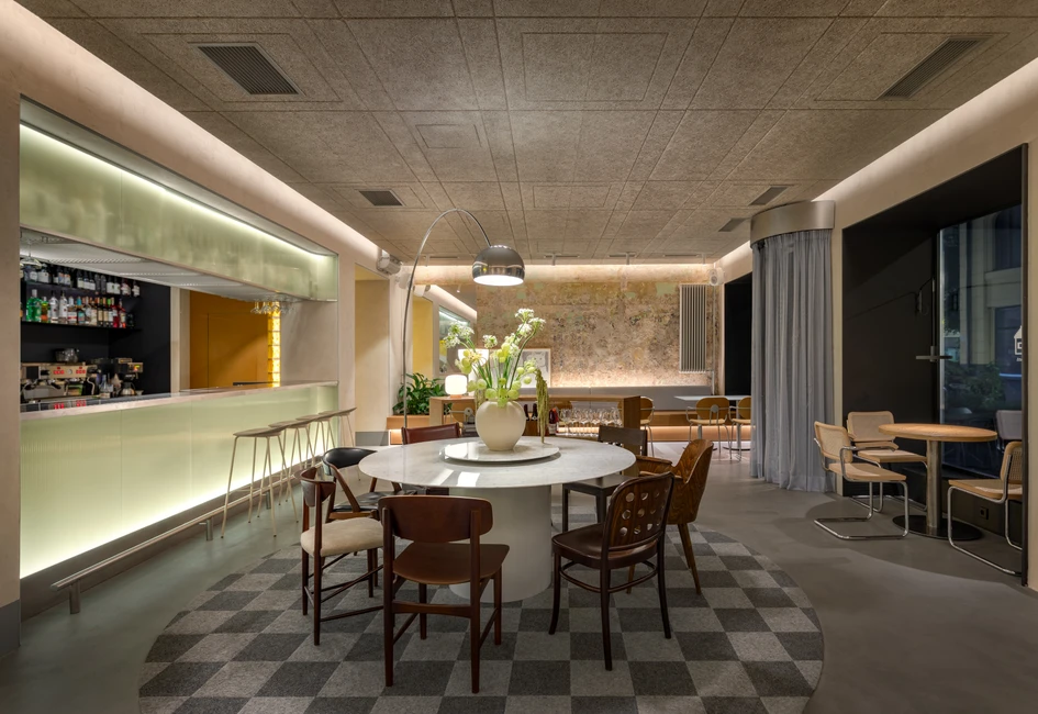 We began working on the project when it was still planned to open under the name Butter Club, so Butter was the working name. During the creative process, the team came across the phrase “Life is like butter – when everything cools down, it can be transformed into something new.” The combination of the new establishment and its historically rich location inspired the concept: “The time is now.” We decided to create a space that would breathe new life into old elements while encouraging guests to embrace the present. Original finishes are responsible for the history of the interior, and comfortable soft shades and natural materials combined with bright and warm yellow accents add to the feeling of being in the moment.
