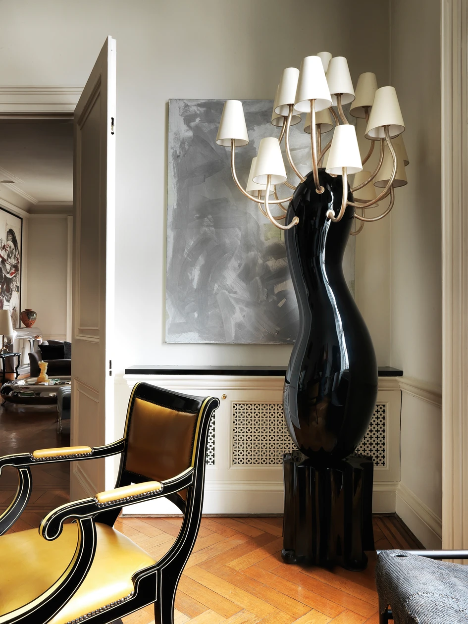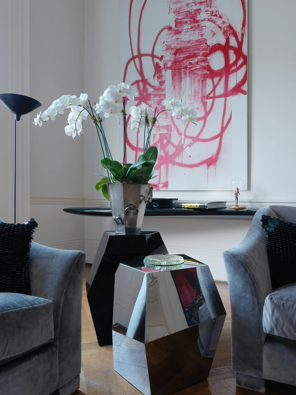 Walls and curtains are kept to neutral palettes whilst the furniture and visual art is allowed to take precedence yet without becoming dominating. Featured artwork includes Richard Prince and Josh Prince, objets by Jean Cocteau and Constance Spry, furniture from Fredrikson Stallard, Mattia Bonetti and Garouste & Bonetti as well as Sultana’s long term collaborator the late Zaha Hadid as well as the designer’s own pieces.