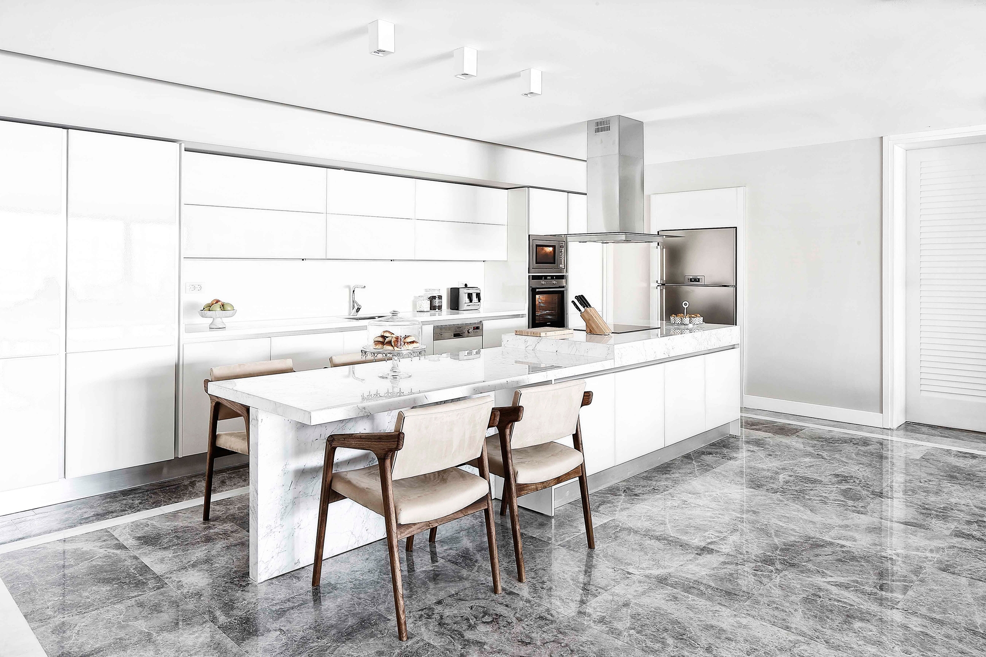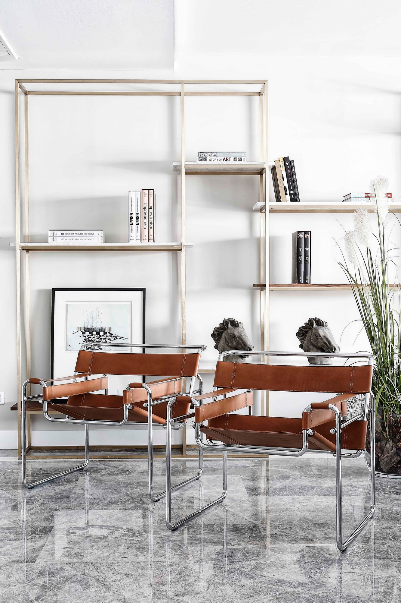 Modern and minimalist style shows itself through every detail in the house. Living space is a blend of minimalistic lines enriched with luxurious materials such as brass, various Italian marbles used both in furnishings and floorings. Texturized bright colored fabrics makes a resemble to Bodrum’s deep blue sea and summer spirit. Custom designed midcentury style cabinets and storage units, premium solid wood coffee tables in organic shapes tunes up with general aesthetics designed to comfort the residents.