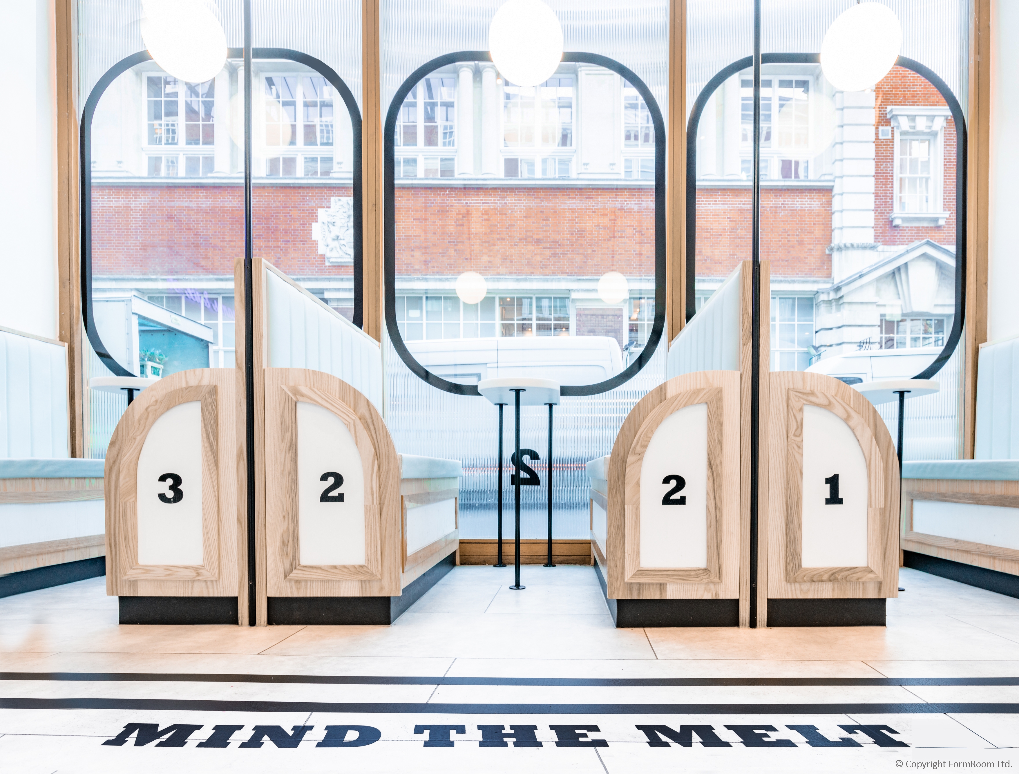 Train station visual cues continue throughout the space using mosaic tiling and wayfinding; including a play on the iconic British underground messaging with “Mind the Melt” embedded into the floor. The brand’s signage and ordering system mimic timeless shutter board platform design.