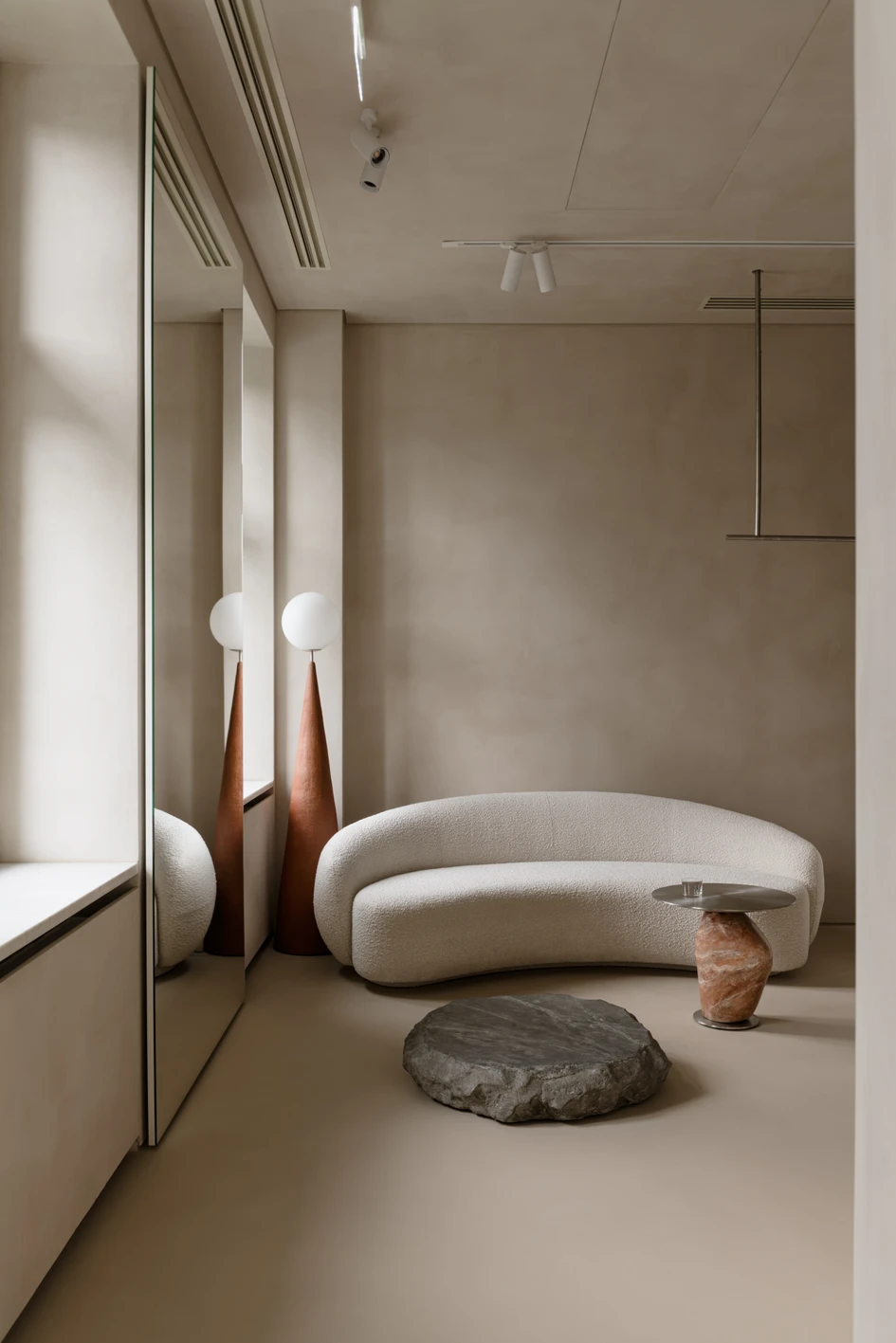 Next to the oval, the minimalist fitting room with a window is a favorite among clients. It has the best natural light from the window facing the street. The lamp was custom-made – contractors baked clay and tinted it to achieve the desired shade. The podiums in the fitting rooms are made of plaster covered with microcement and hand-painted. The small coffee table is also made of plaster covered with microcement with a metal top.