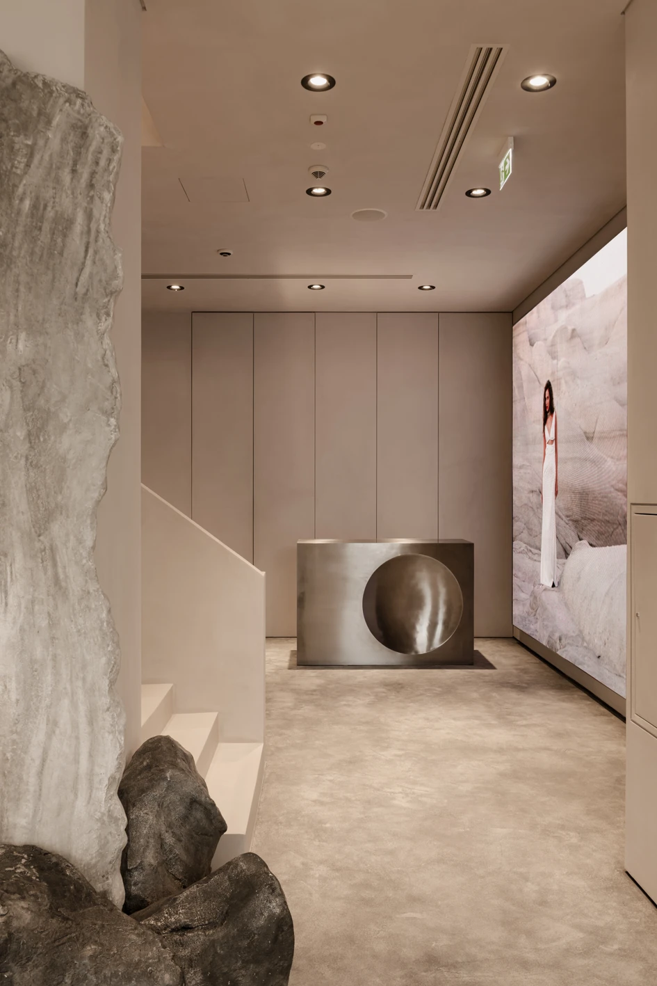 On the ground floor, to the right of the showroom’s main entrance from inside the passage, customers are greeted by a reception with a compact waiting area. The reception desk is made of stainless steel according to an individual sketch – its rectangular shape with a curved circle refers to the moon. This object looks deceptively simple, but it is a painstaking work: the steel is bent on factory machines and then joined to the frame. To the right of the counter, a large custom lightbox is mounted on the wall, broadcasting the brand's promotional videos, which were created to match the interior of the salon.