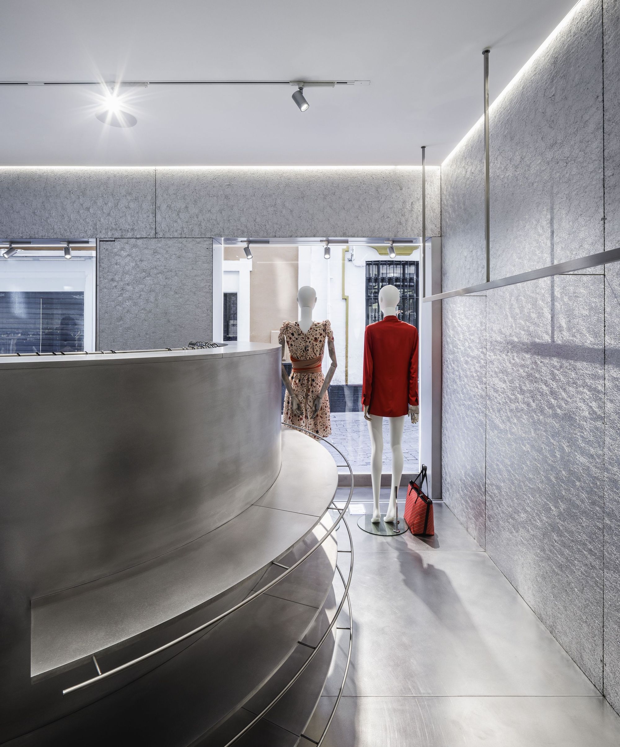 The pavement made of large stainless steel pieces works together with the aluminum to offer a powerful image, united, neutral and consistent, allowing the clothes, with their infinite universe of shapes and colors, to become the absolute main character of the exhibition space.