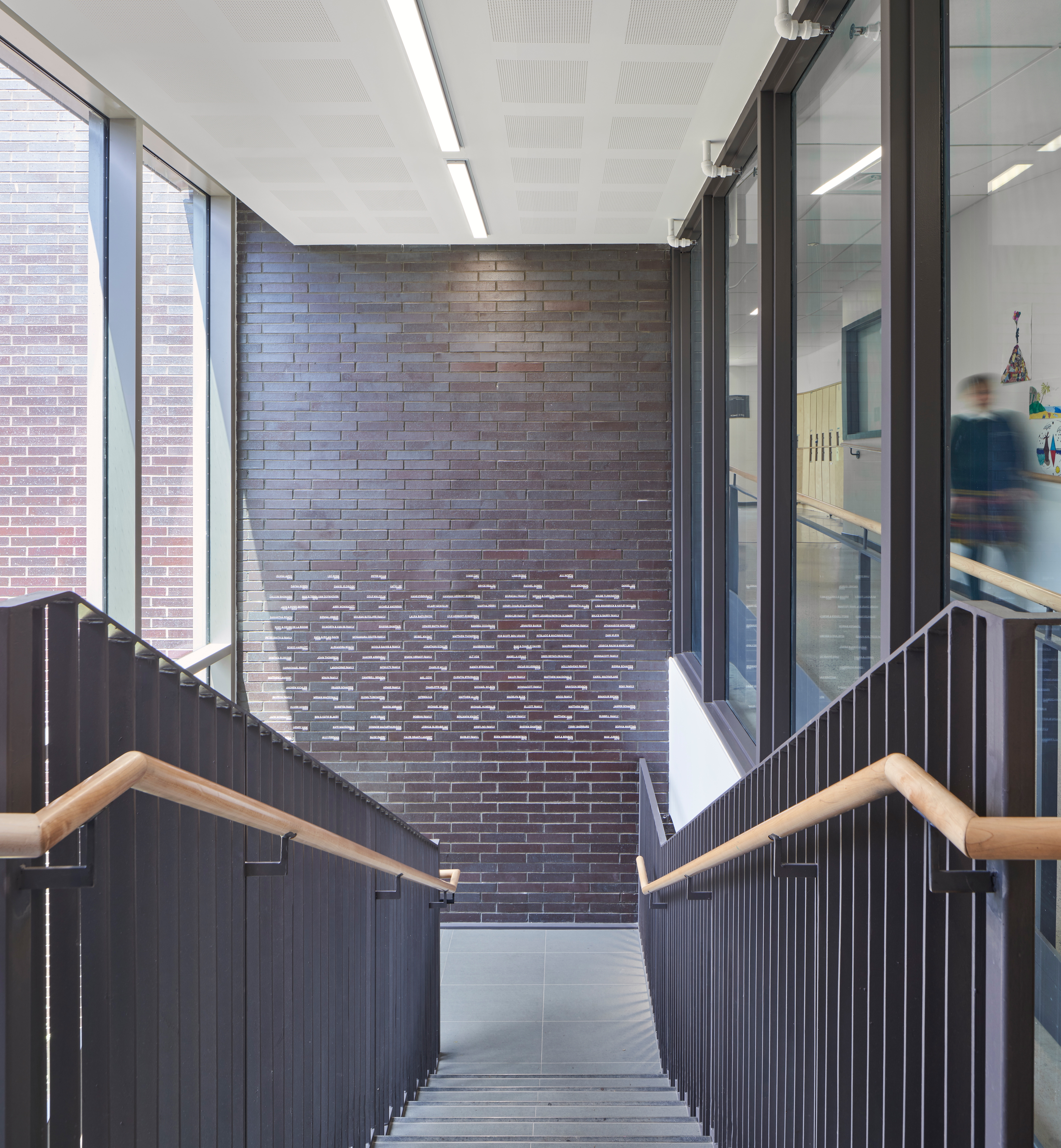 The addition features glazed galleries along the field edge, large windows in all new classrooms, and a new curtain wall in the atrium that frames the main stair and looks out onto a new learning garden.