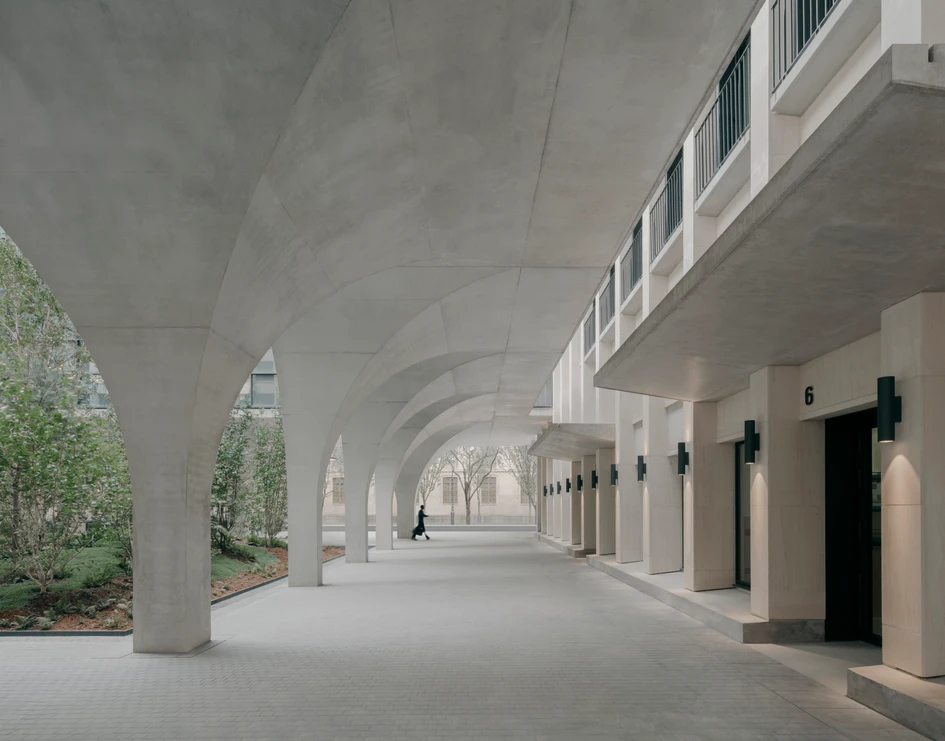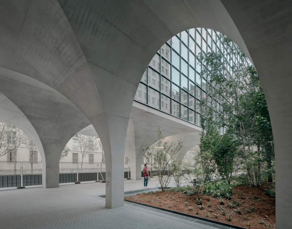 Two new building volumes facing the boulevard and the River Seine, which mediate between the scale of the existing and neighbouring buildings, contribute to the repair of the city. The volumes are raised above the ground to create a new public axis that provides a passage from the boulevard to the River Seine. Load-bearing, vaulted arcades characterize this passage at ground floor level and act as a counterpart to the stringent column grid of the existing ensemble. The arcades establish an inviting entrance gesture to the campus, guiding passers-by into the interior of the complex.