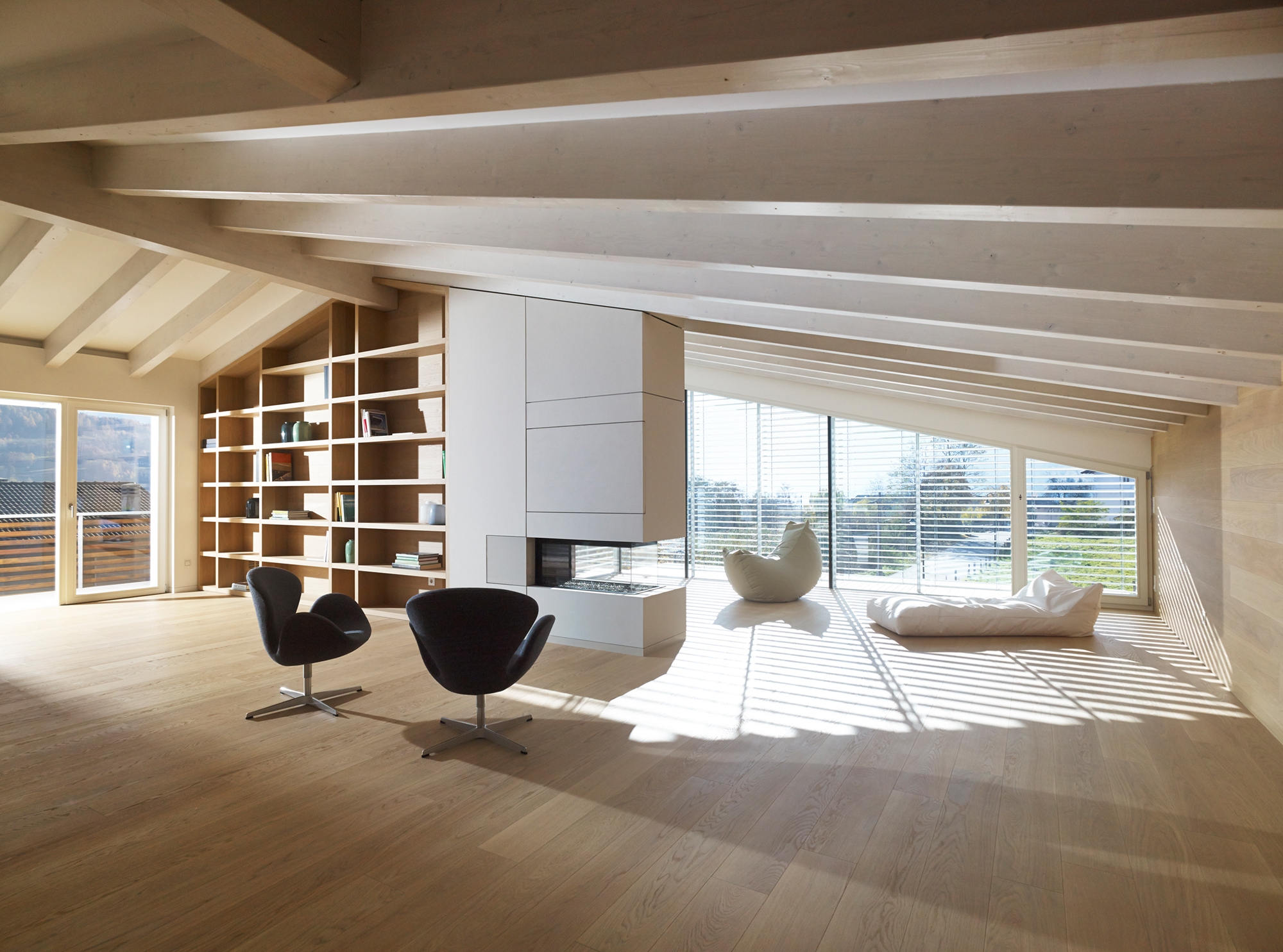 The furniture project is based on the observation of the surrounding landscape and the analysis of the actions that take place there; exactly the lake, in which is reflected a circle of wood-covered mountains, is able to evoke images of great freedom, such as the practice of outdoor sports, recreation, but also suspension from tasks, protection, the deserved rest. The furniture, with its succession of full, the working time and empty leisure, evokes just the need to find a new balance between opposites, to regenerate body and mind. Natural vegetal and mineral materials are used, such as oak, declined as a coating for floors and walls, and lime plaster, which can both be practical, yet extremely comfortable. Vegetable and minerals materials are to be found in the garden, which has become the place where the wild and the domestic landscape melt into one another, wood is used as a coating, in the paving and pergola that casts a shadow onto the barbecue, Levocell characterizes both the sidewalk entrance, and the vaso-bench, green wedges, with hedges, lawn and ground cover in the living area.