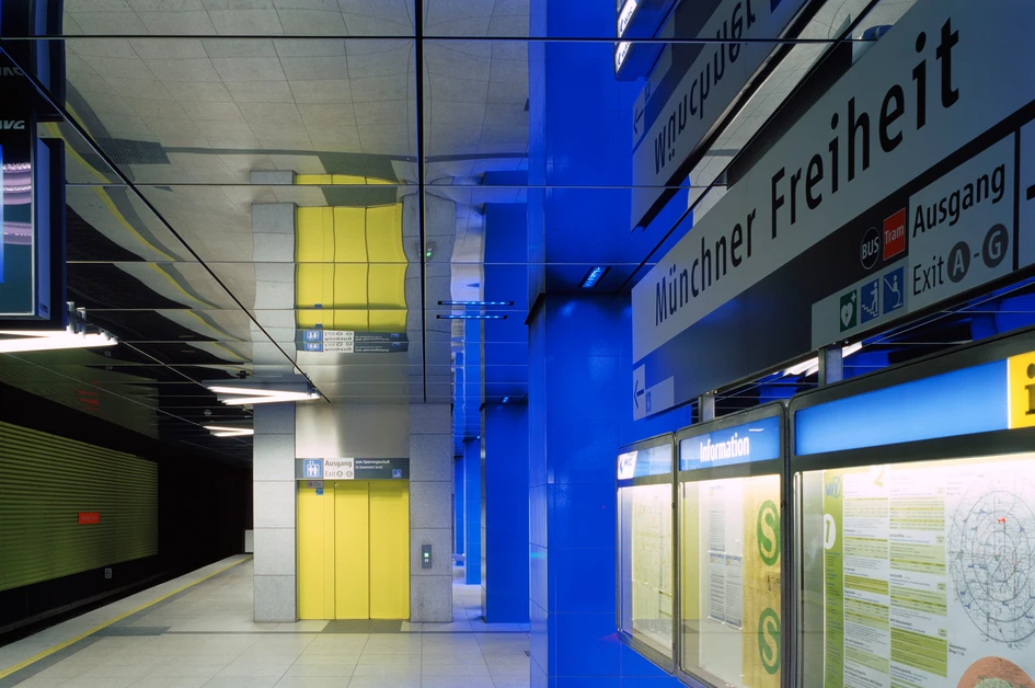 The remodelling work on one Munich‘s principal subway stations „Münchner Freiheit“ is now complete. Ingo Maurer developed the lighting and colour concept in collaboration with Munich’s municipal building administration division which was responsible for all architectural planning, project management and the realization of the remodelling work. The final result is a sophisticated blend of the lighting concept, interior, and architectural design components. „Münchner Freiheit“ is a key interchange and main thoroughfare for the city‘s underground public transportation system. The station is used by up to 50,000 commuters each day. „Münchner Freiheit“ provides access to Schwabing, a quarter reknown- ed for shopping, nightlife, and the „Englischer Garden“, an idyllic setting within the city, with green expanses, walking paths, gentle streams, and beer gardens that has made it an important public gathering place.