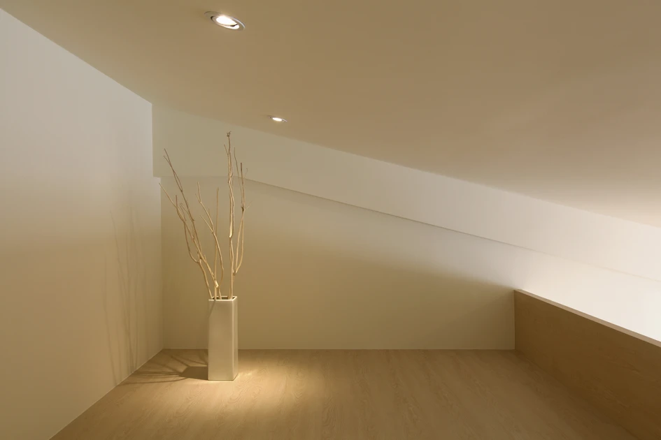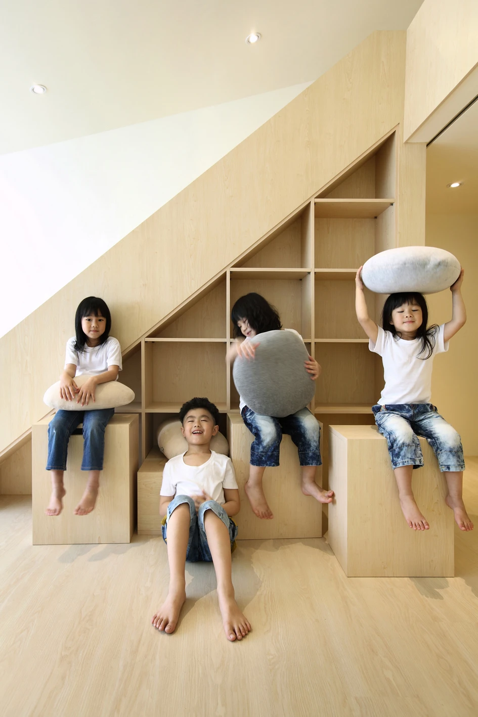 The stair and slide to the penthouse are the soul of this spatial design, and the integration of bookshelf and multiuse storage box become the furniture for different event.
