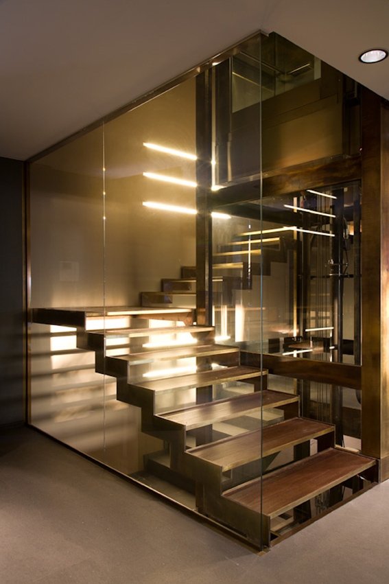 Each interior has its own lighting project: for the living room/kitchen lighting is given by small points of light that highlight the material of the walls and the volumes of the furniture, the stairs made in brass and glass is marked by simple lines of light that multiply in the moke-colored glass giving a total irradiance. Small signs of great aesthetic and emotional value. The large windows designed by the architect Carlo Donati are an invisible filter between inside and outside, at dusk they give to the architecture a new and deeper meaning.
