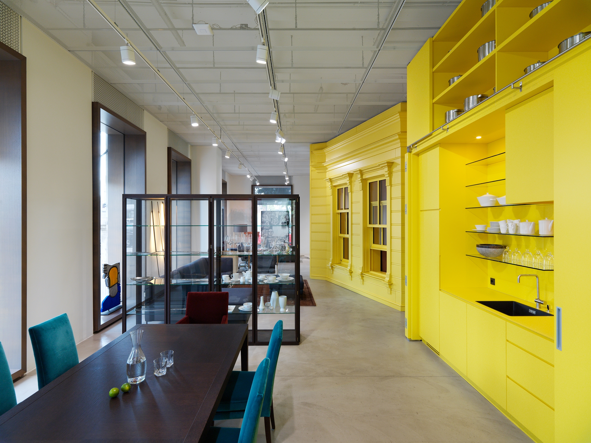 For the flagship store, the BEHF architects-team focussed intensively on the core competences of the traditional brand “Neue Wiener Werkstätte”. Tradition, Craft and Design are the three values from which the ideas and basic concept were derived. The core of the entire flagship store is therefore the Craft, symbolised by the continuous wall panelling in luminous “Matisse-Yellow” and which is made up of the various furniture ranges from the Neuen Wiener Werkstätte and the window facades from KAPO. The walls reflect the quality craftsmanship of the producers and place the focus on the skills and achievements of the domestic workers.