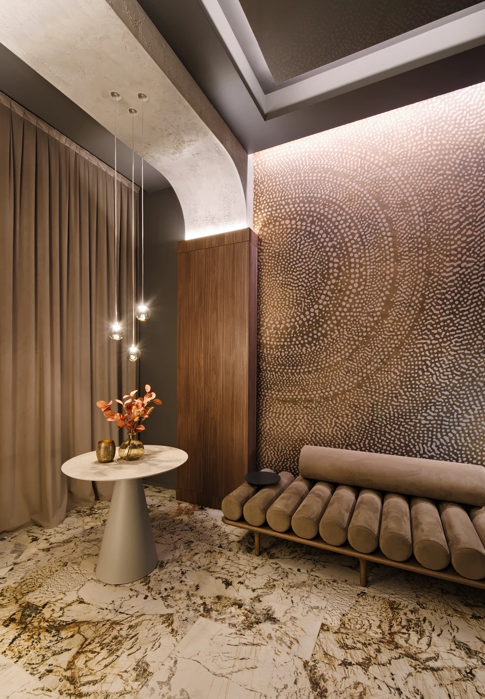 The relax area on the ground floor was enhanced by a warm boiserie, curtains and soft lighting, and the Soul wallcovering. With its concentric golden details, the subject recreates the effect of a walk through a forest lit by the sun's light defines an intimate ambience.