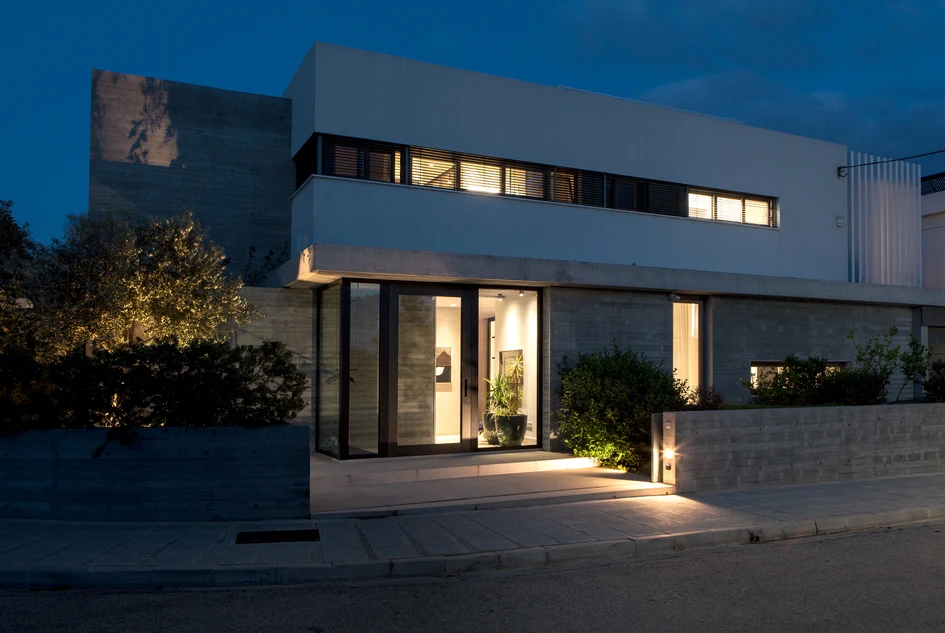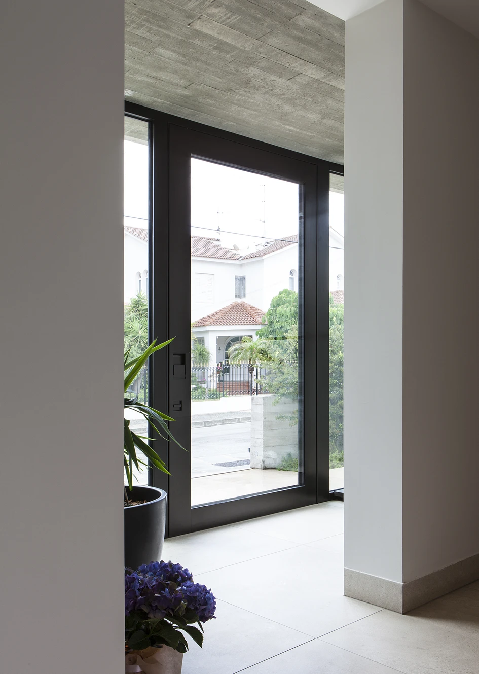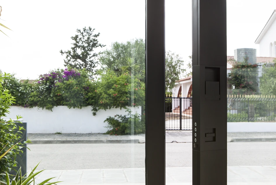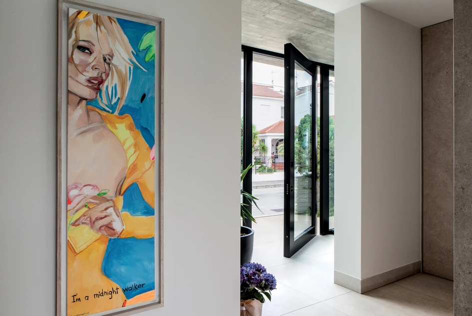 The highlight of the project is the central element of the entrance, the Nova door characterized by wide side panels. Beyond its primary security function, this innovative door contributes to the overall aesthetic appeal of the villa and creates a sense of modern elegance. The play of textures further elevates its style.