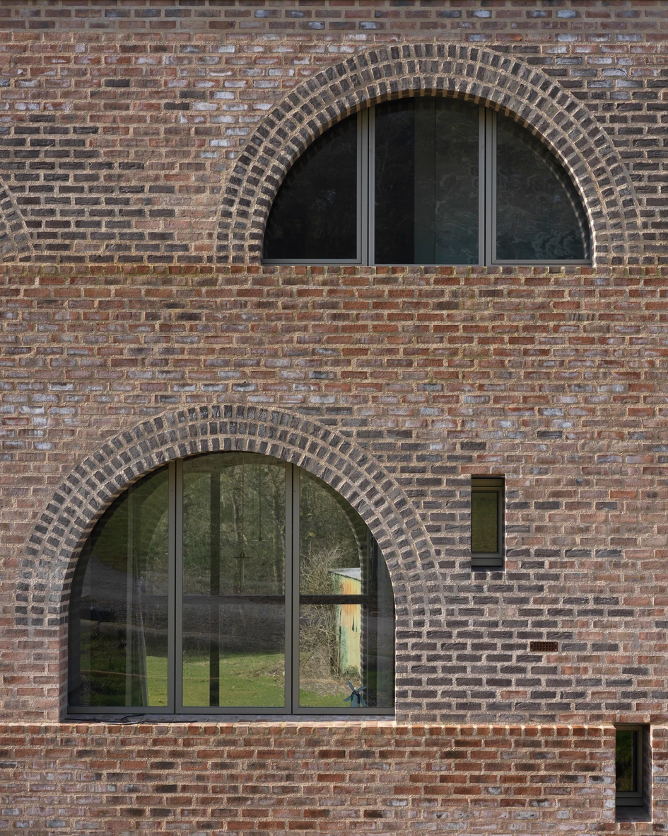 The house is built from structural concrete and wrapped in a thick brick skin with a black zinc roof. The profile of the house ascends in a stepped motion, rising from a single-storey entrance on the north elevation to a three-storey tower, which is expressed as a grid on the south elevation. Arched brick window openings with deep reveals give cadence to the long side elevations, expressing the weight of the walls. The sense of motion created by this stepped form is emphasised by the patina of the brick skin; blackened bricks around the arched brick window openings create an optical illusion, a trace of movement through space.