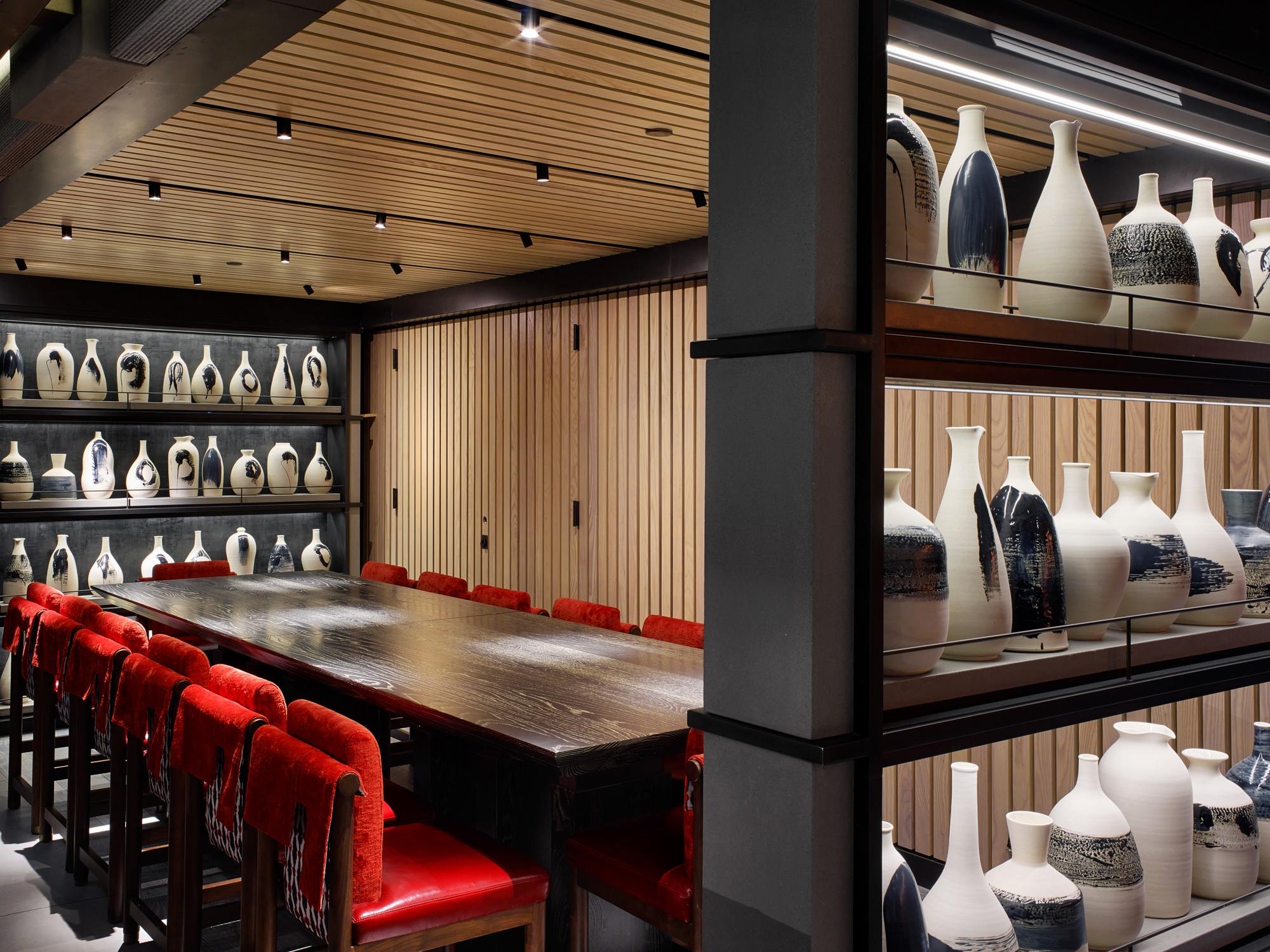 The 13-seat sushi bar is made of ash and blackened steel. The upholstery of the custom bar stools continue the idea of a kimono draped over the back of the chair. Off to the side, two shelving units form the walls of an intimate sake room. The shelves are filled with handmade ceramic sake carafes by Girardin.