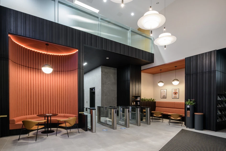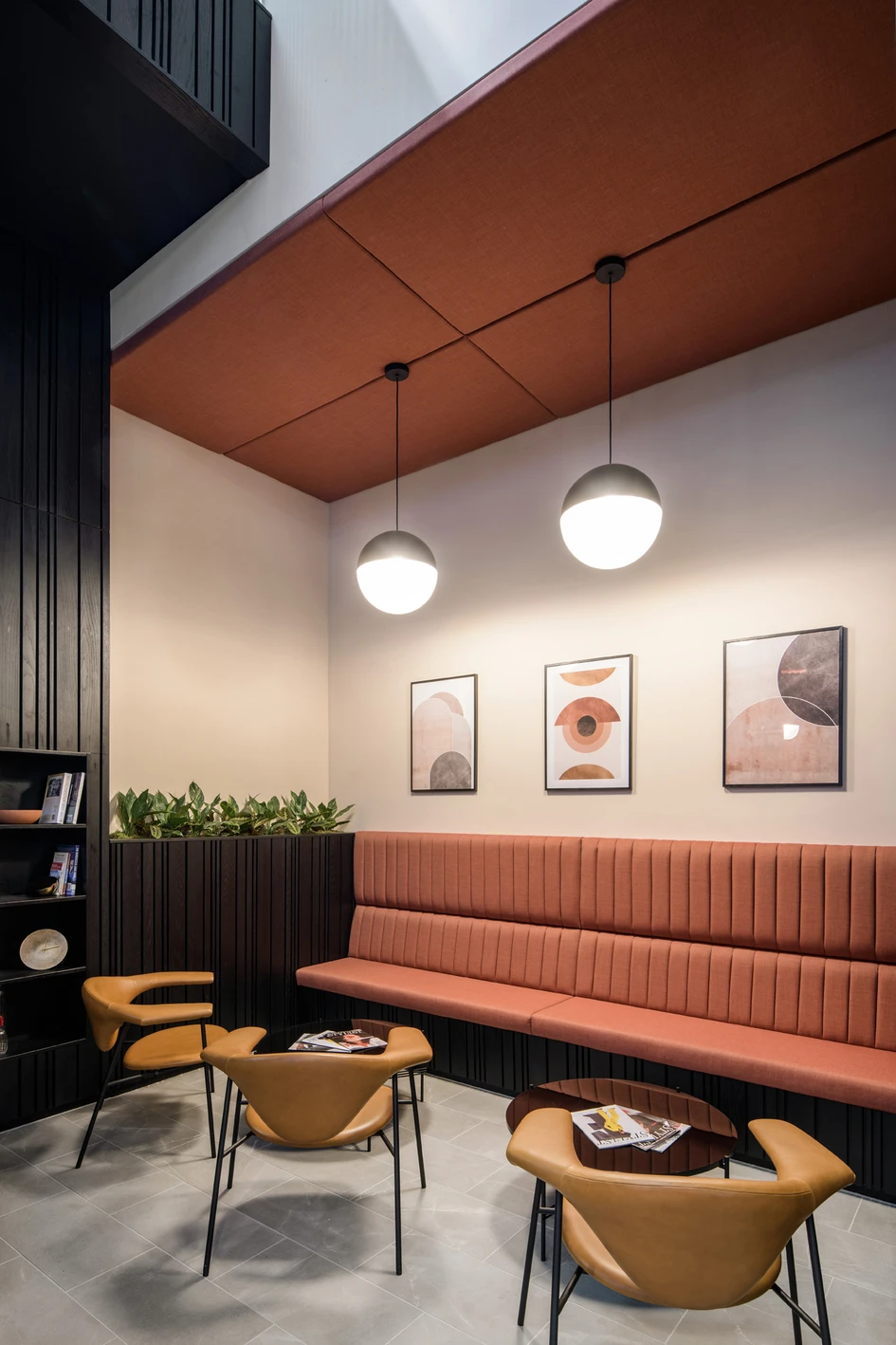 The strong and dramatic finishes in the reception play on ideas of light and dark, as well as the idea of piercing and puncturing, with black-stained timber wall cladding and strong inset pops of terracotta. The terracotta colouring features in both the loose furniture and in the curved and straight banquette seating areas, as well as in the vertical ribbed upholstery in the stand-out curved nook section.
