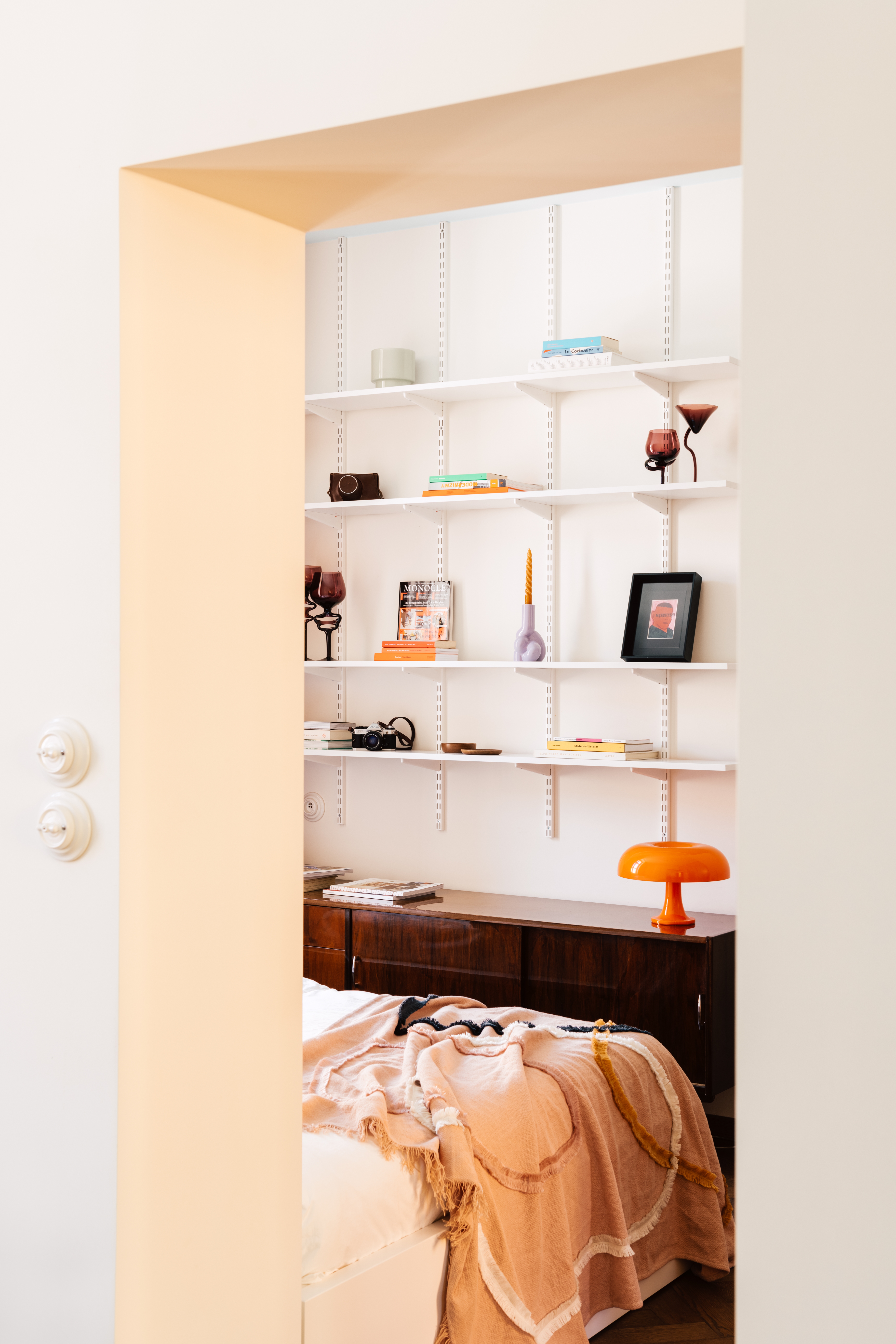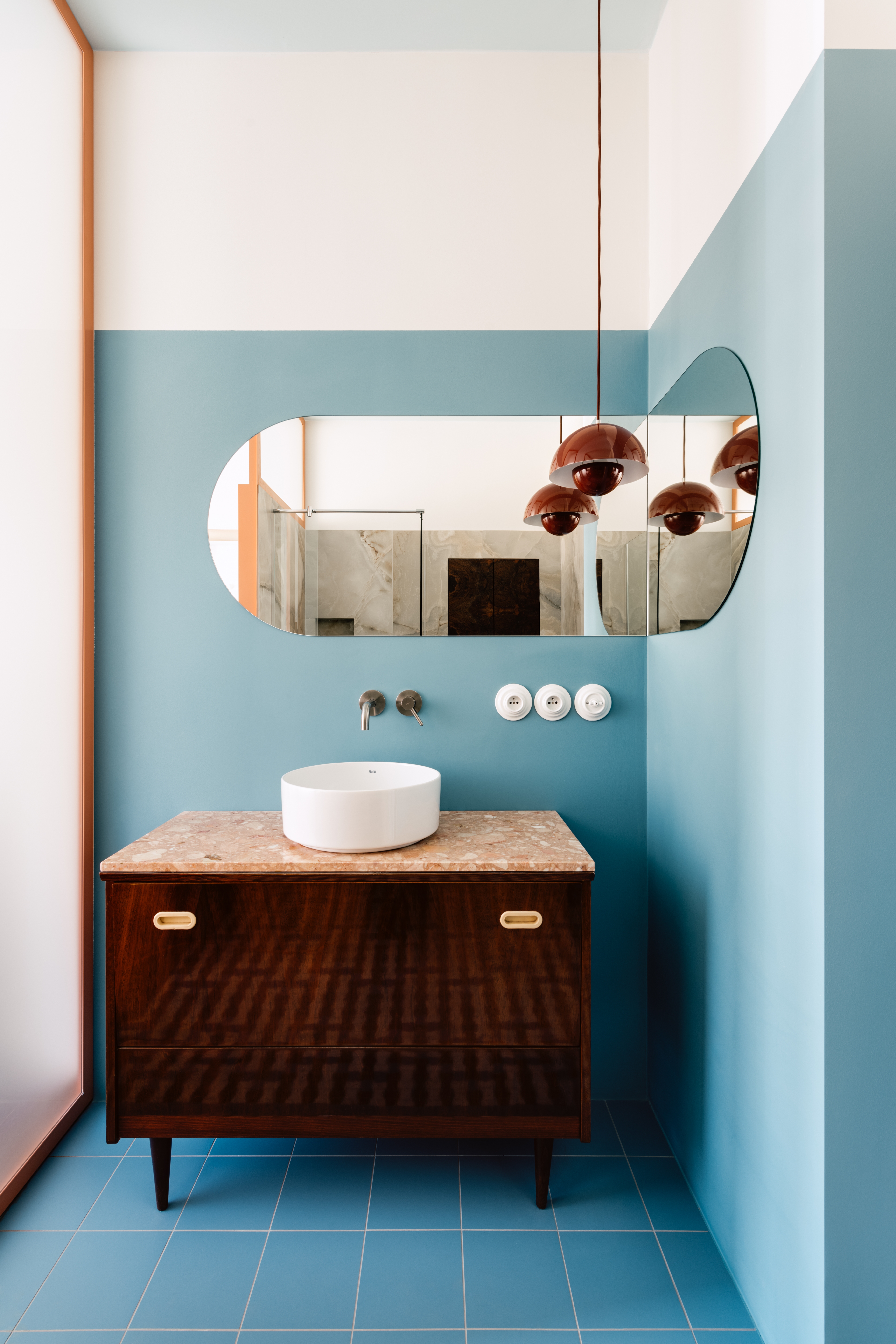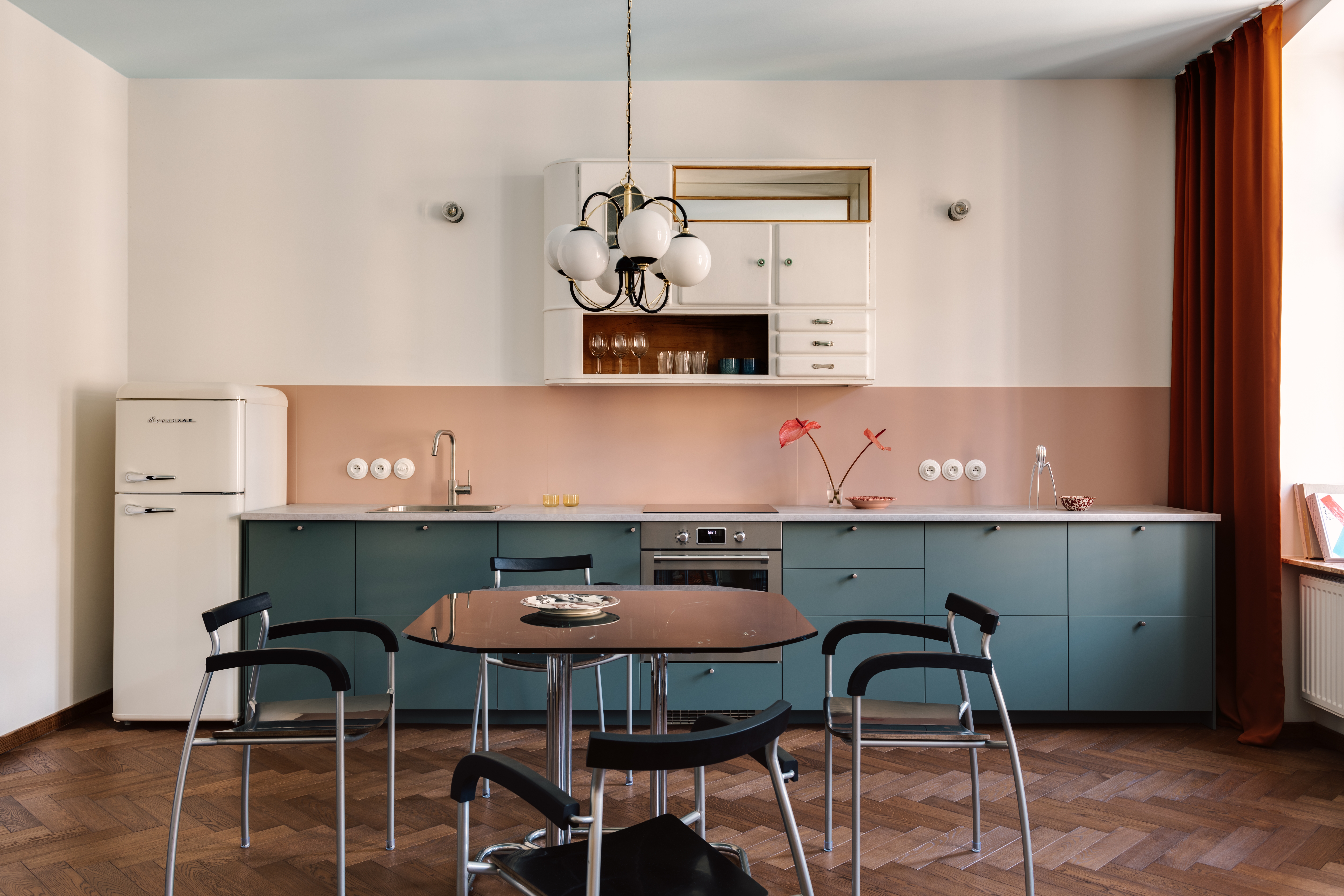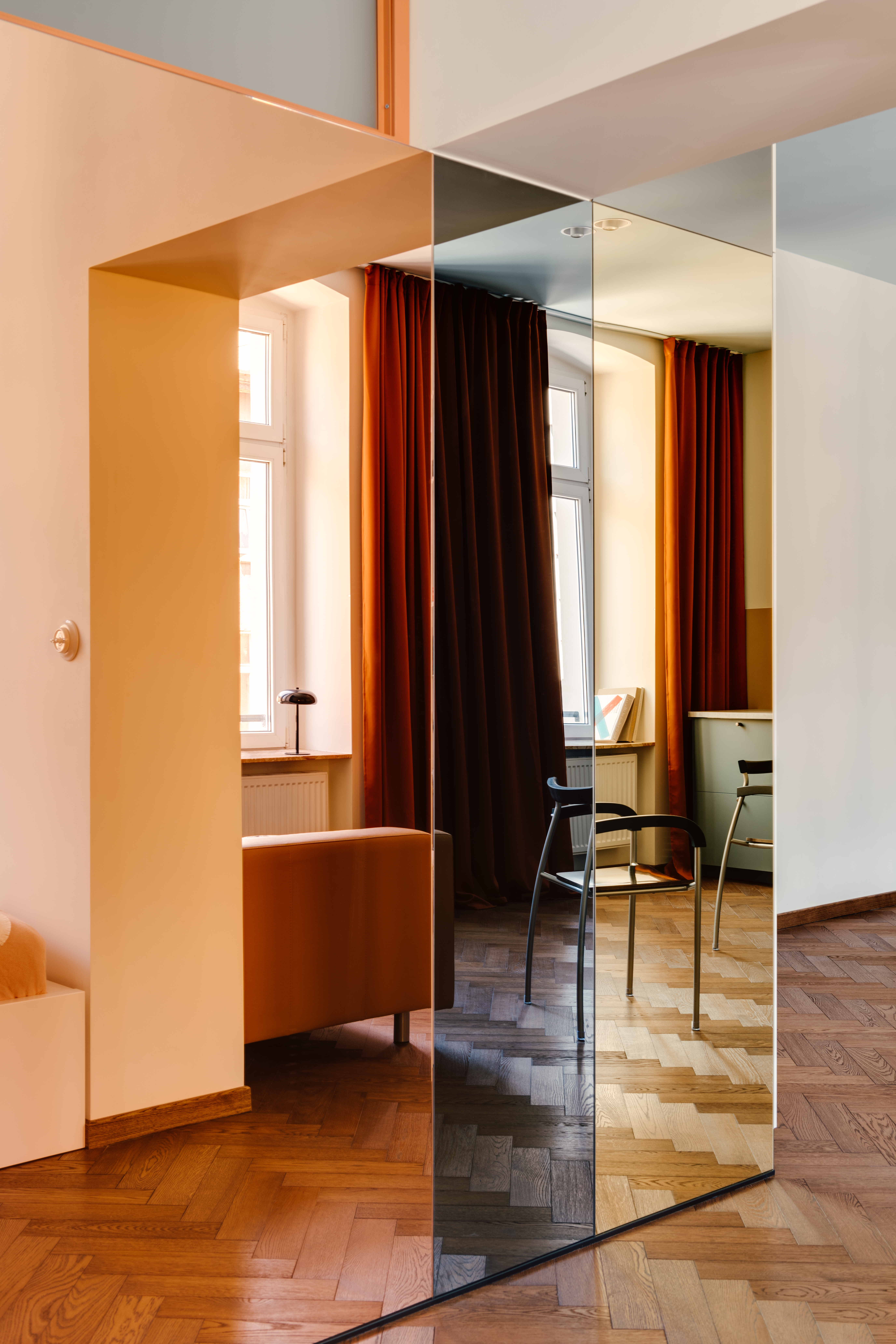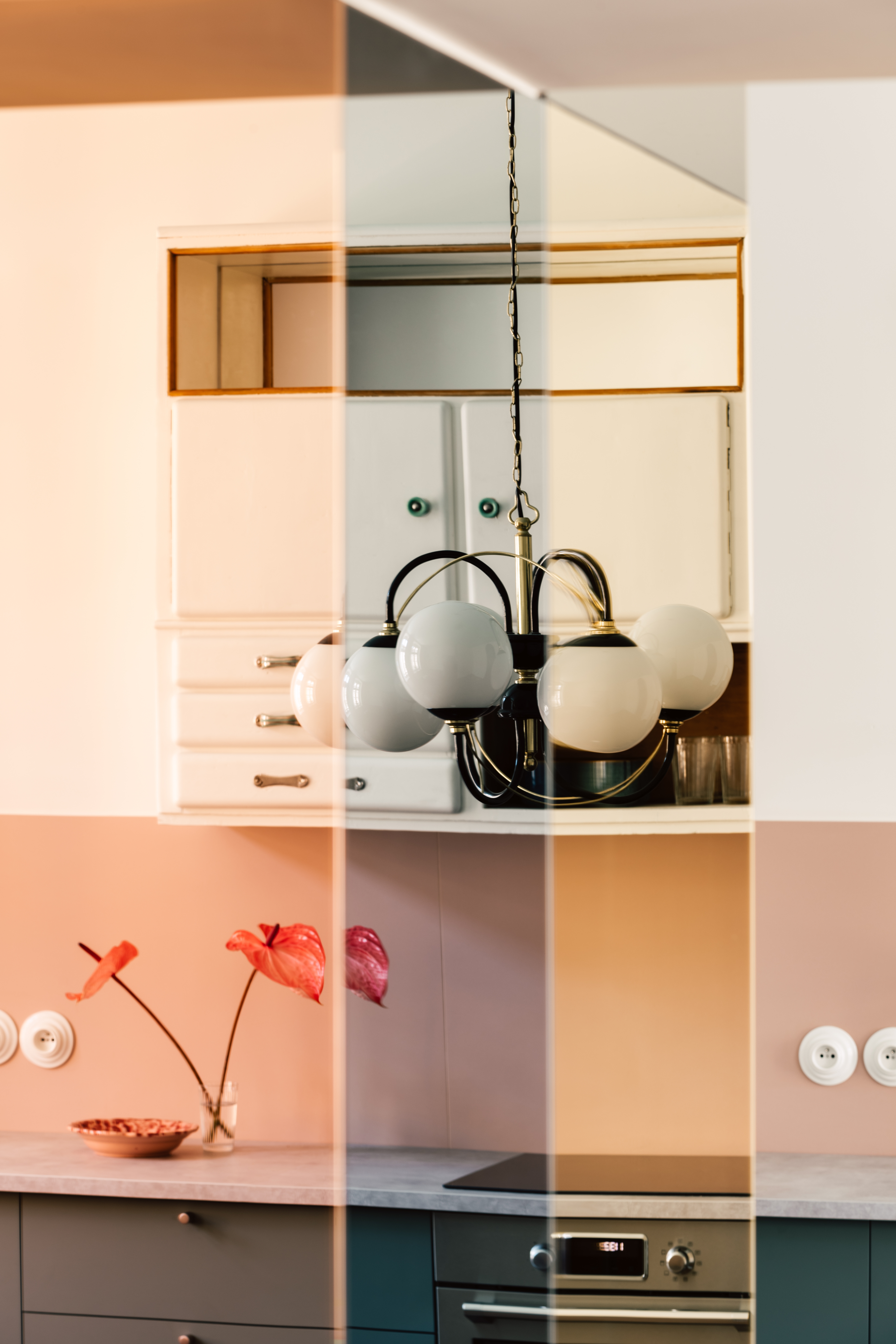 Before we could proceed to selecting the furniture, the interior needed to undergo a few major changes. The original design placed the bathroom in the current living room. Moving it somewhere else in order to create more living space was the designers’ first step. It allowed us to create a lot of living space connected to the spacious kitchenette and the dining room, explain the architects. The designers separated the bathroom from the bedroom using a light construction made of pink steel profiles. The frosted glass filling them provides the necessary privacy. Ensuring there is enough storage space was another crucial element of the project. In short-term rental spaces, it is incredibly important to find space for a closet. In this design, it was smartly hidden behind a wall of coloured mirrors, which at a first sight seem to serve no other purpose than the aesthetical, when, in fact, it hides a very creative solution. Storage space in the bedroom was also achieved in an unordinary way – through white shelves originally meant for the wardrobe, which here have been mounted on one of the walls, creating a gallery of unique objects. A classy, oak hardwood floor made by the investor’s father fit perfectly into the town house’s interior. In order to soften the relatively dark floor, the designers decided to go with light pastel colours – blue can we found – atypically – on the ceiling (its height accommodated this unique solution), among the coloured mirrors, on the bathroom walls, and, in a slightly different version, also on the fronts of the kitchen cupboards. Pink rules in the kitchen, on the powder-coated bathroom furniture, and an adept eye will also spot it on the windowsills and on the top of the old linen closet functioning as a cupboard under the bathroom sink. Only the bold, intense navy of the front door breaks out from among the pastel colours. The door has been additionally made taller thanks to the painted archway topping it. Dark Negro Macondo navy welcomes the guest in the threshold (literally).