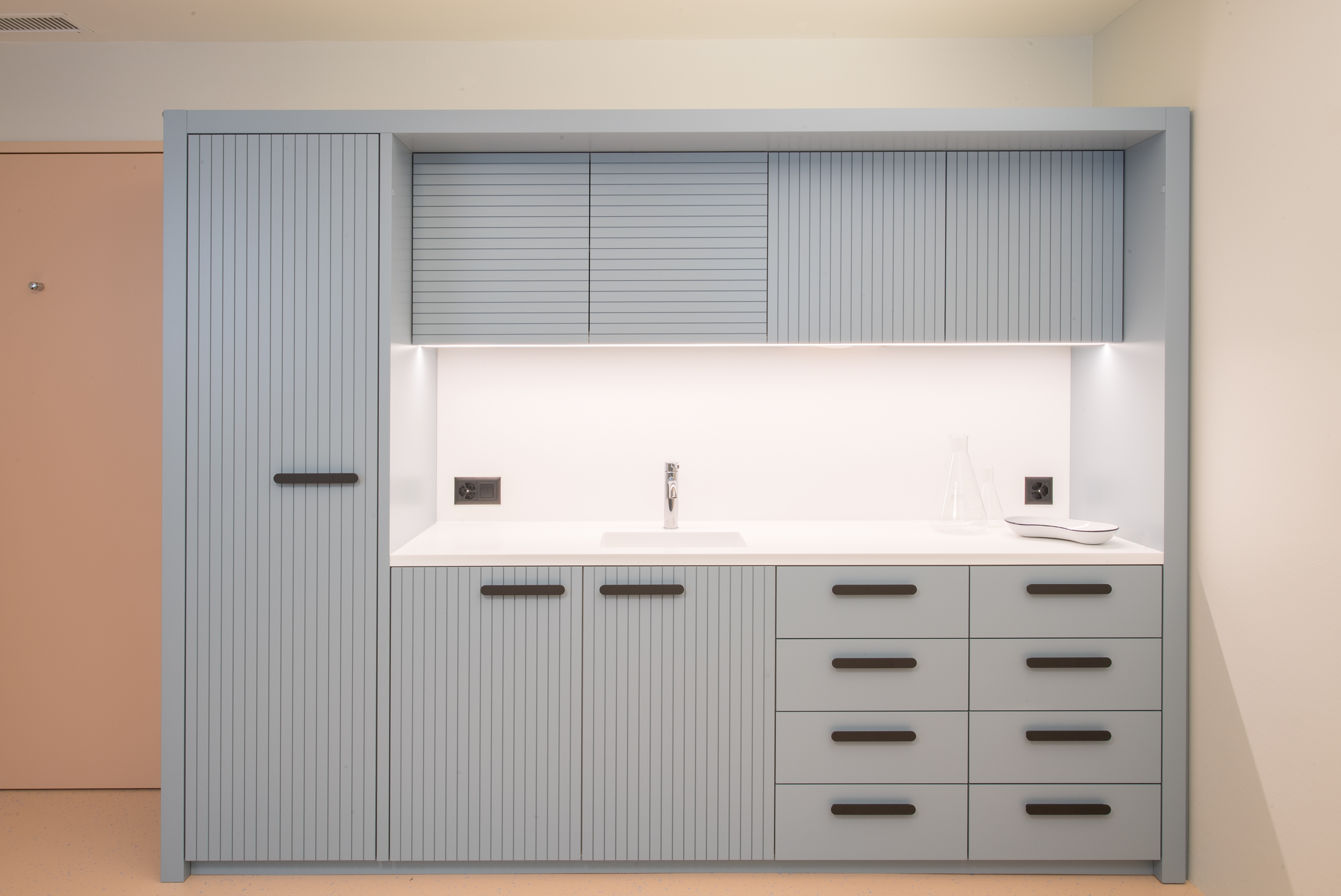 Within two weeks and with a precise budget, a new architectural concept was realized to be able to welcome the patients again as quickly as possible. This included new wall and floor coverings, a modern lighting concept, the reception area as well as all practice fixtures, furniture, signage as well as visual and sun protection.New easy-to-clean surfaces and a holistic architectural concept optimize the practice‘s internal processes.