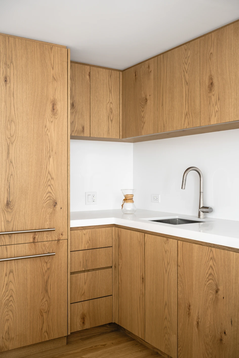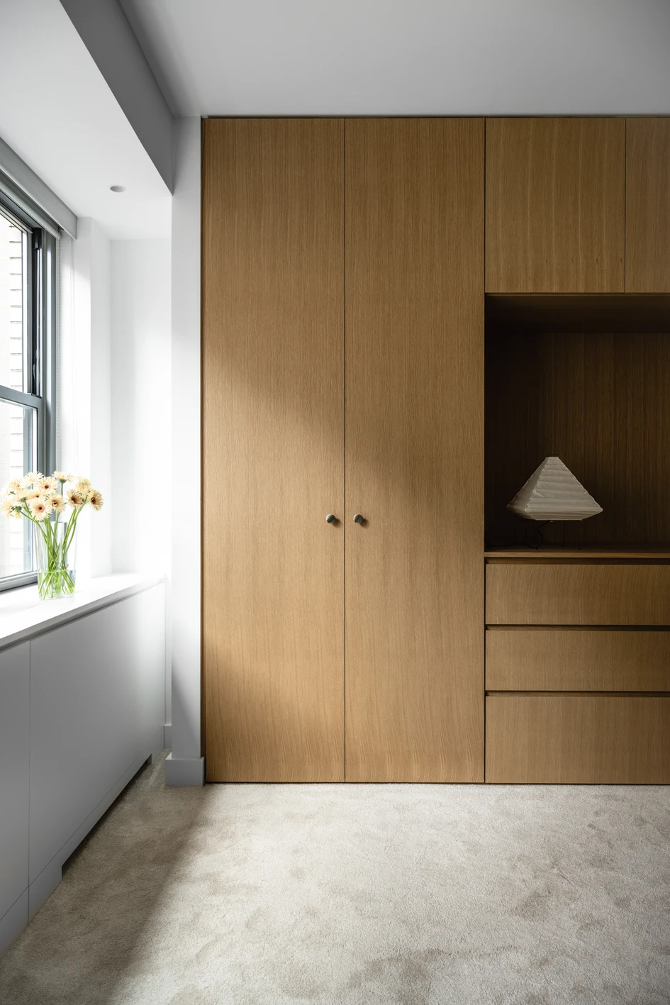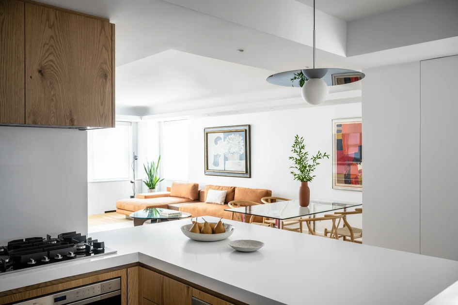 The kitchen serves as a central hinge point in the apartment. Its partitions were completely removed, and a new peninsula projects into the dining area, increasing its usable space and creating a more integrated environment. Introducing an open kitchen allows natural light to reach into the core of the apartment, and provides a smooth transition between social and private areas. The new custom cabinetry, fabricated from a white oak live flitch, and the countertops, molded of white engineered stone, were constructed by Townhouse Kitchens. Above the peninsula, a Bola Disc pendant by Pablo Studio floats, echoing the lightweight playful lines of a Joan Miró artwork on the adjacent wall.