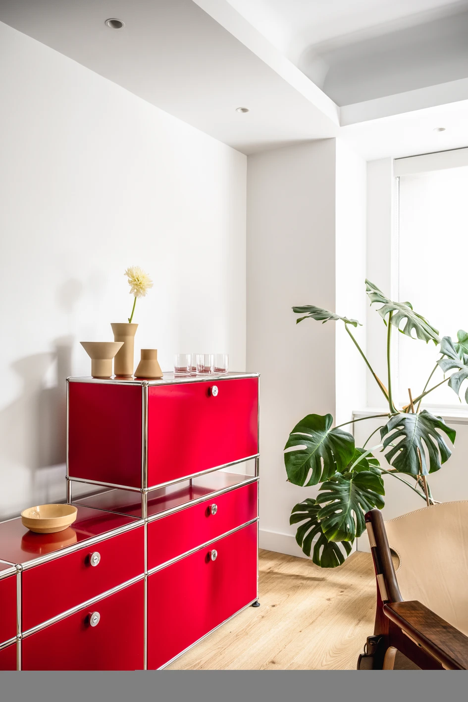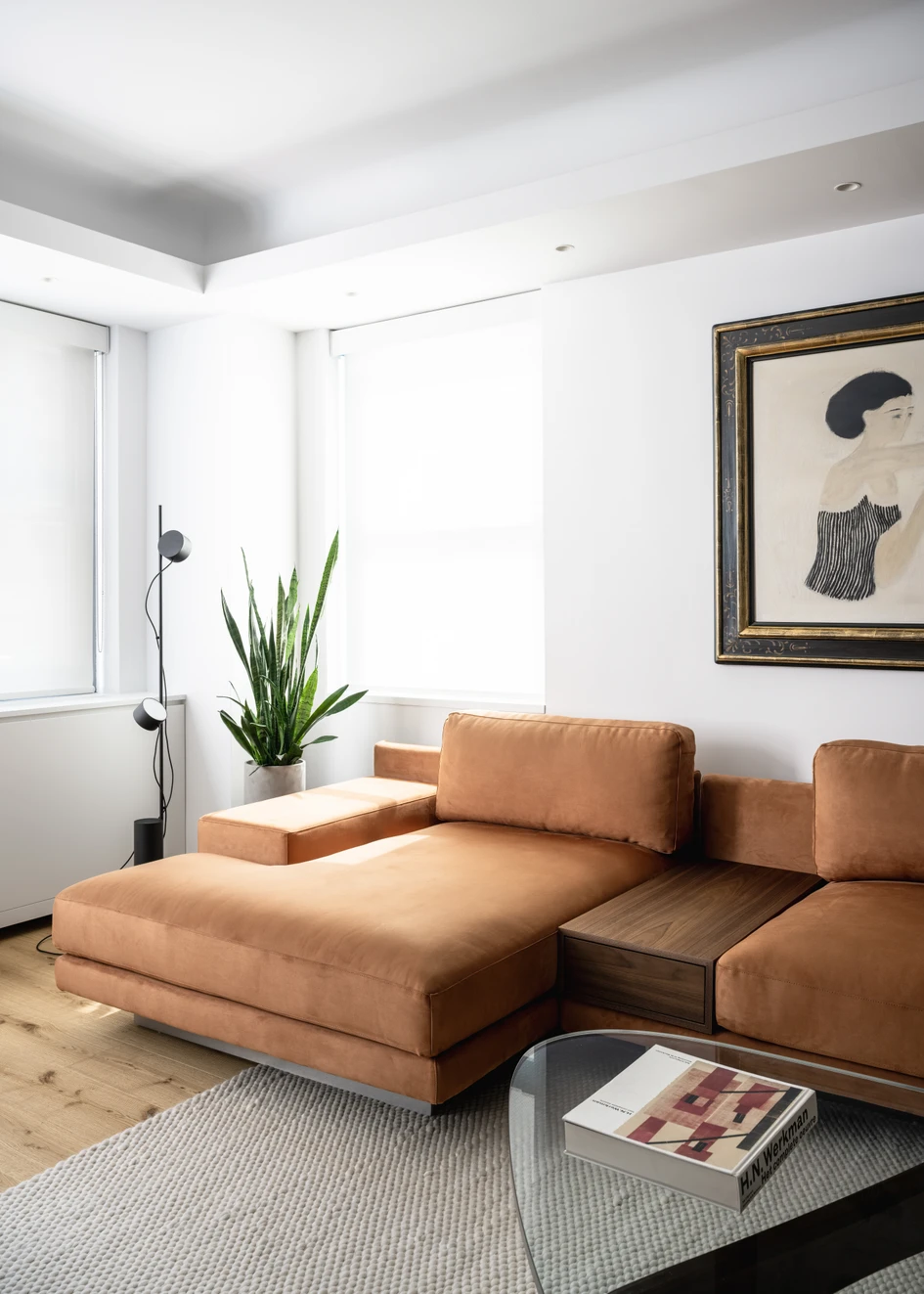 The living room’s main seating area, overlooking 57th Street, is anchored by the family’s collection of modernist furniture. It includes a custom designed USM Haller media console and bar, and a coffee table by Isamu Noguchi, with an infusion of tropical warmth from the imbuia wood of a Kilin chair and Mocho stool by Brazilian designer Sergio Rodrigues. The post floor lamp is by Earnest Studio, with an art piece by Paolo Ridolfi.
